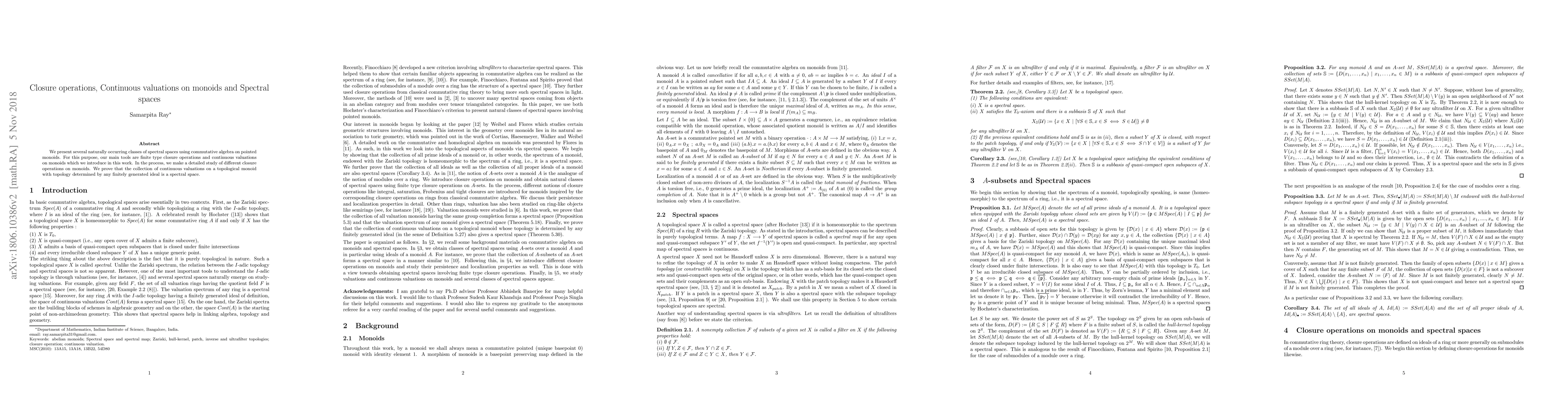 This paper introduces closure operations and continuous valuations on monoids to define classes of spectral spaces. It demonstrates that continuous valuations on monoids with topologies defined by finitely generated ideals form spectral spaces.