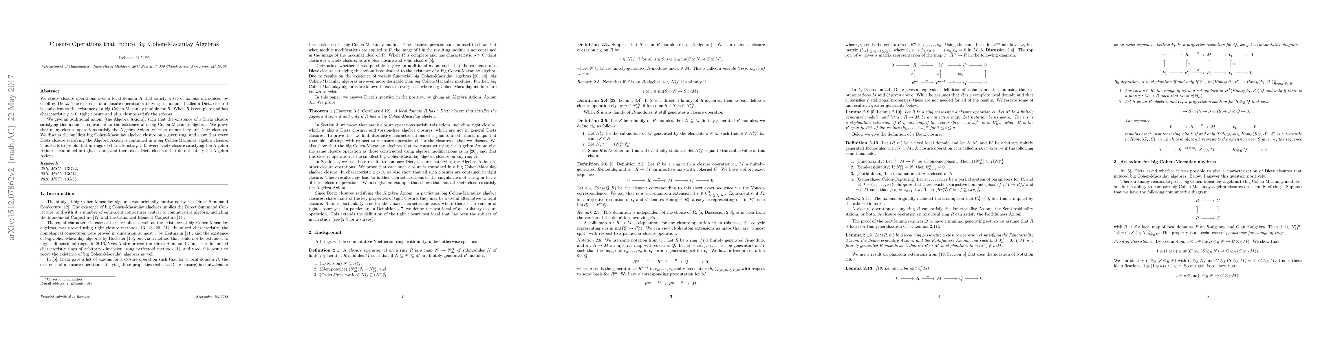 This paper explores closure operations over local domains that induce big Cohen-Macaulay algebras, introducing an additional axiom (the Algebra Axiom) to characterize such operations. It proves that many closure operations satisfy this axiom and discusses the smallest big Cohen-Macaulay algebra closure, showing that Dietz closures satisfying the Algebra Axiom are contained within it.