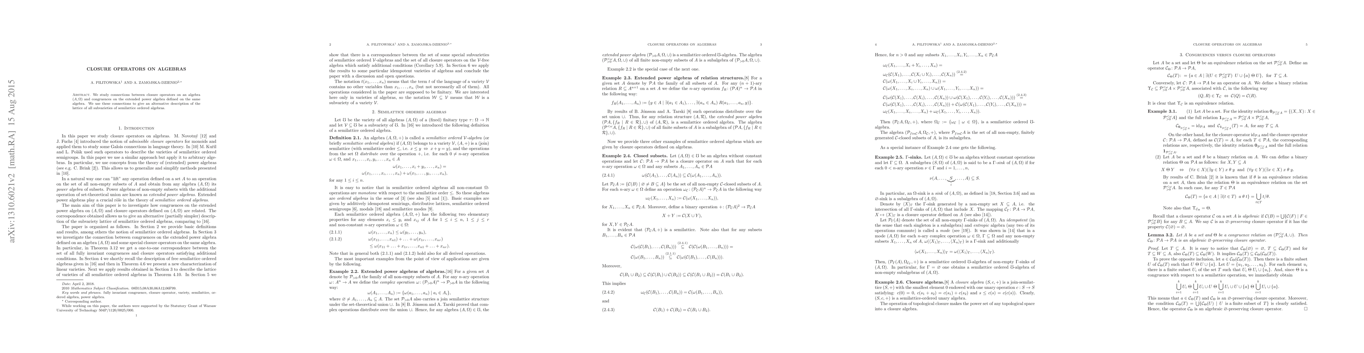 This paper explores the relationships between closure operators on an algebra and congruences on its extended power algebra, providing an alternative characterization of the lattice of subvarieties for semilattice ordered algebras.