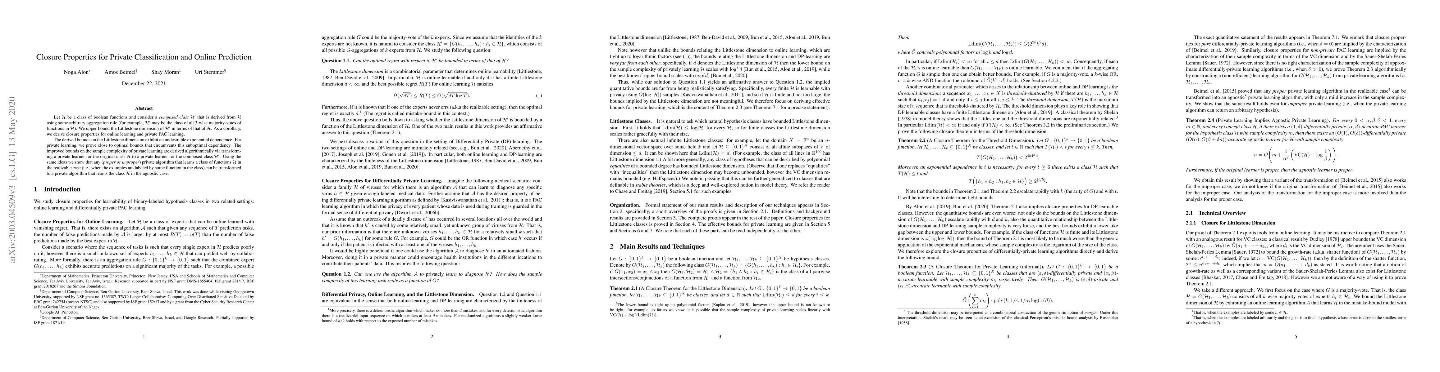This paper explores closure properties for private classification and online prediction, establishing bounds on the Littlestone dimension for composed classes of boolean functions derived from an original class. It introduces improved bounds for the sample complexity of private learning, demonstrating how private learners for the original class can be transformed to handle composed classes, with optimal results in the realizable case extending to the agnostic case.