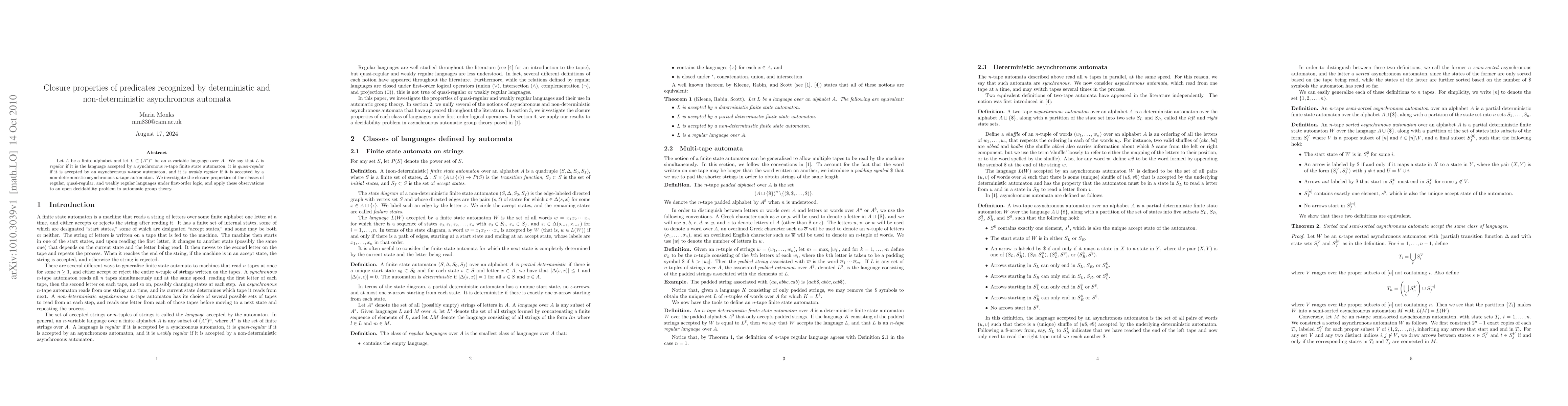 Let A be a finite alphabet and let L contained in (A*)^n be an n-variable language over A. We say that L is regular if it is the language accepted by a synchronous n-tape finite state automaton, it is quasi-regular if it is accepted by an asynchronous n-tape automaton, and it is weakly regular if it is accepted by a non-deterministic asynchronous n-tape automaton. We investigate the closure properties of the classes of regular, quasi-regular, and weakly regular languages under first-order logic, and apply these observations to an open decidability problem in automatic group theory.