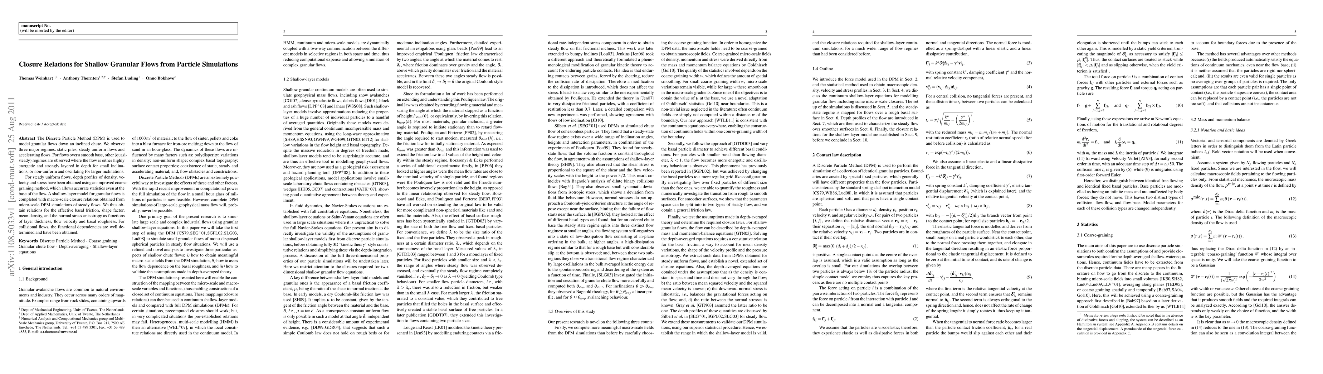 This paper uses the Discrete Particle Method to model granular flows and identifies three major regimes: static piles, steady uniform flows, and accelerating flows. It develops closure relations for a shallow-layer model of granular flows, deriving effective basal friction, shape factor, mean density, and normal stress anisotropy from micro-scale simulations.