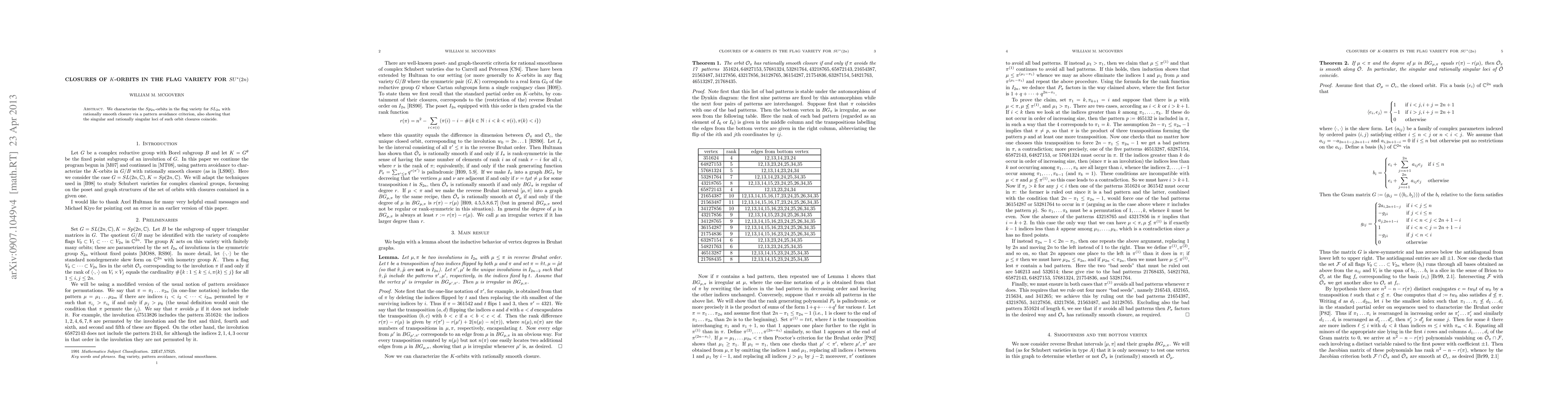The paper introduces a pattern avoidance criterion for rational smoothness of K-orbit closures in the flag variety for SU*(2n), linking combinatorics of permutations with geometric properties of algebraic varieties.