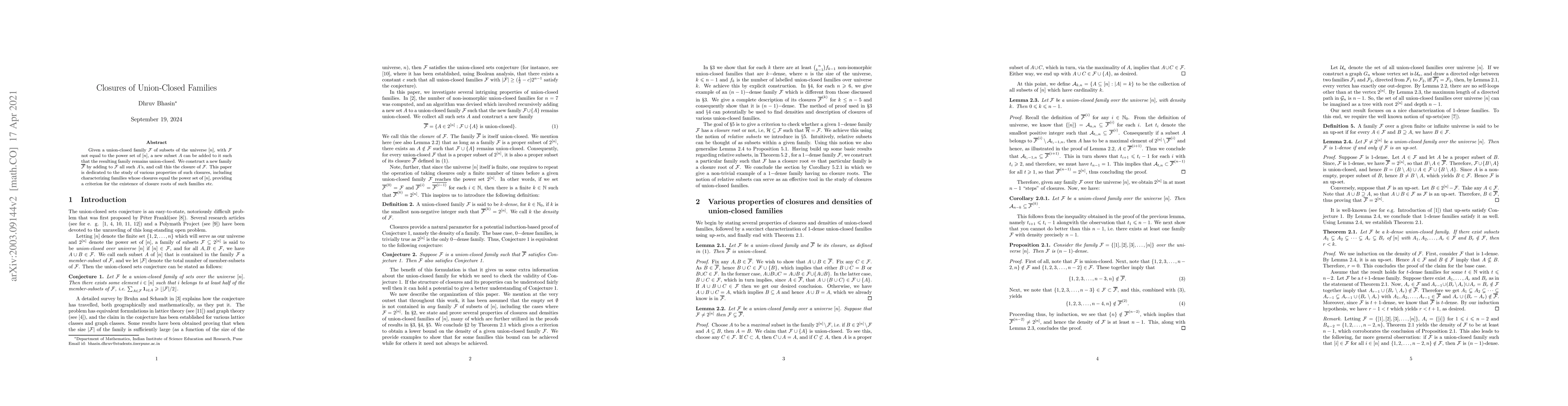 This paper investigates the concept of closures of union-closed families of subsets, focusing on constructing new families by adding subsets that maintain union-closedness. It examines properties of these closures and criteria for when a closure equals the power set of the universe.