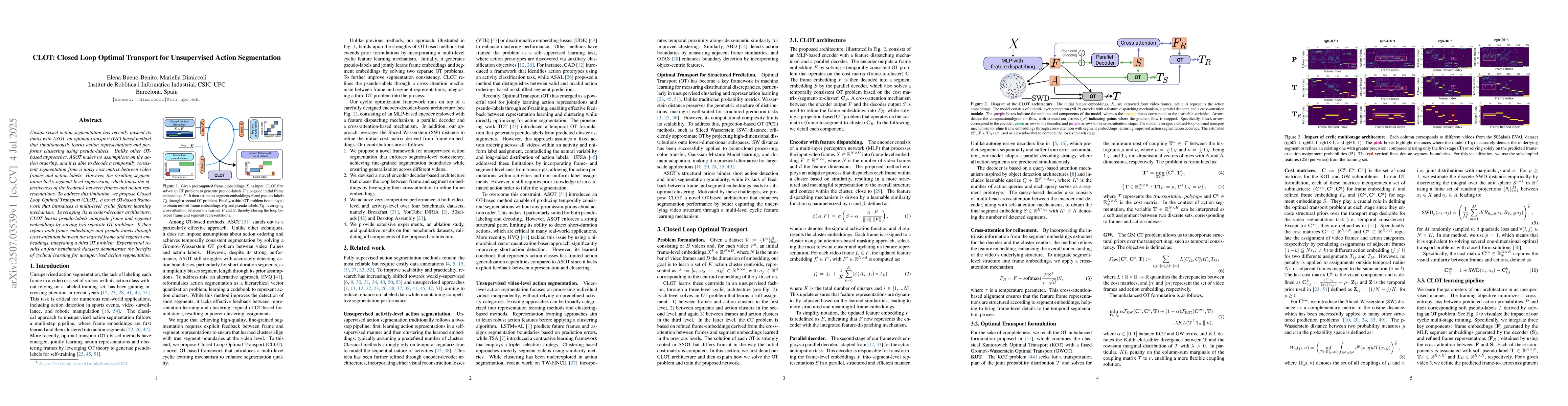 The research introduces Closed Loop Optimal Transport (CLOT), a novel framework for unsupervised action segmentation that improves upon ASOT by incorporating a multi-level cyclic feature learning mechanism. CLOT learns pseudo-labels, frame embeddings, and segment embeddings via separate Optimal Transport problems, then refines them using cross-attention, demonstrating enhanced performance on benchmark datasets.