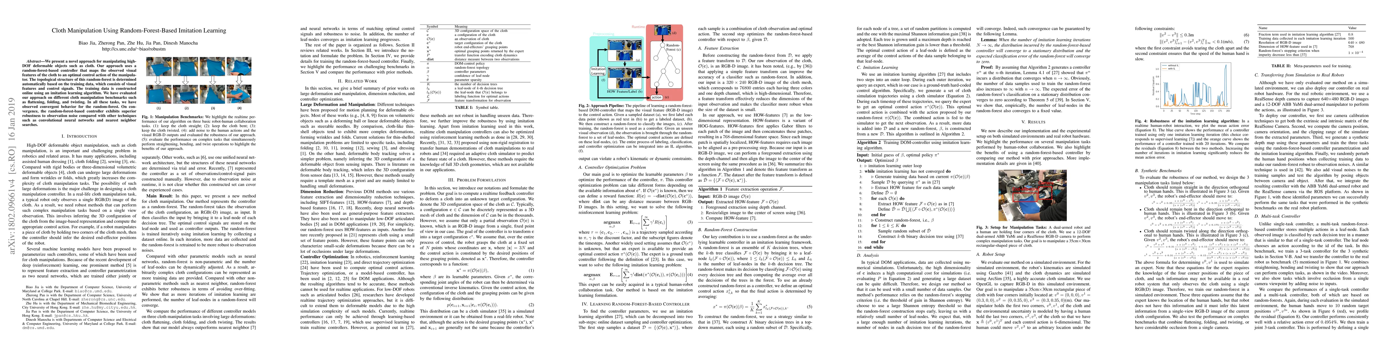 This paper introduces a random forest-based imitation learning method for robust manipulation of high-DOF deformable objects like cloth, achieving better performance and noise resistance compared to simpler controllers. The approach is easy to implement and demonstrates effective results on various cloth manipulation tasks.
