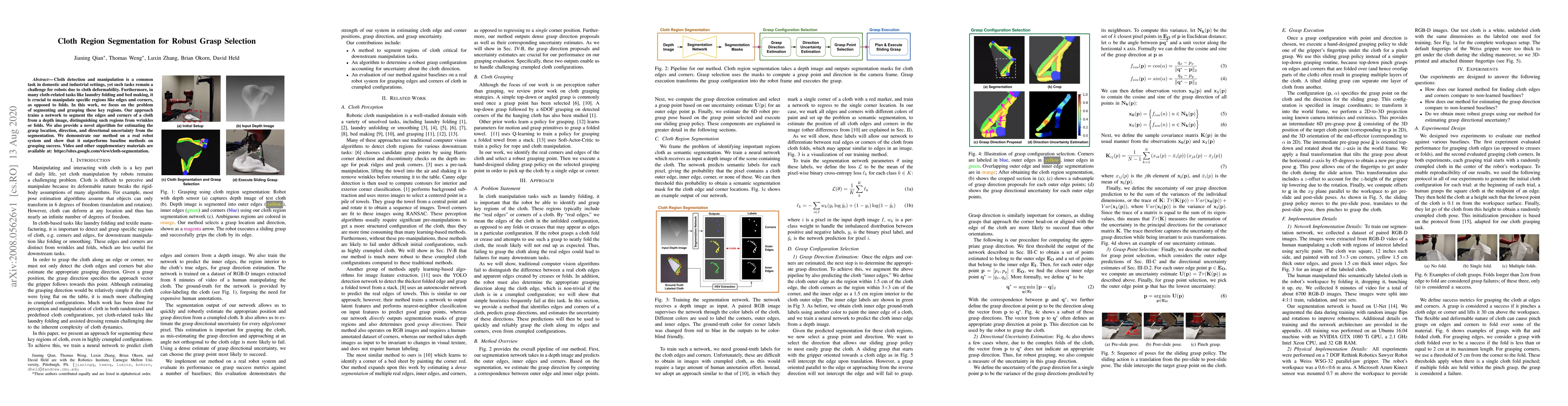 Cloth detection and manipulation is a common task in domestic and industrial settings, yet such tasks remain a challenge for robots due to cloth deformability. Furthermore, in many cloth-related tasks like laundry folding and bed making, it is crucial to manipulate specific regions like edges and corners, as opposed to folds. In this work, we focus on the problem of segmenting and grasping these key regions. Our approach trains a network to segment the edges and corners of a cloth from a depth image, distinguishing such regions from wrinkles or folds. We also provide a novel algorithm for estimating the grasp location, direction, and directional uncertainty from the segmentation. We demonstrate our method on a real robot system and show that it outperforms baseline methods on grasping success. Video and other supplementary materials are available at: https://sites.google.com/view/cloth-segmentation.
