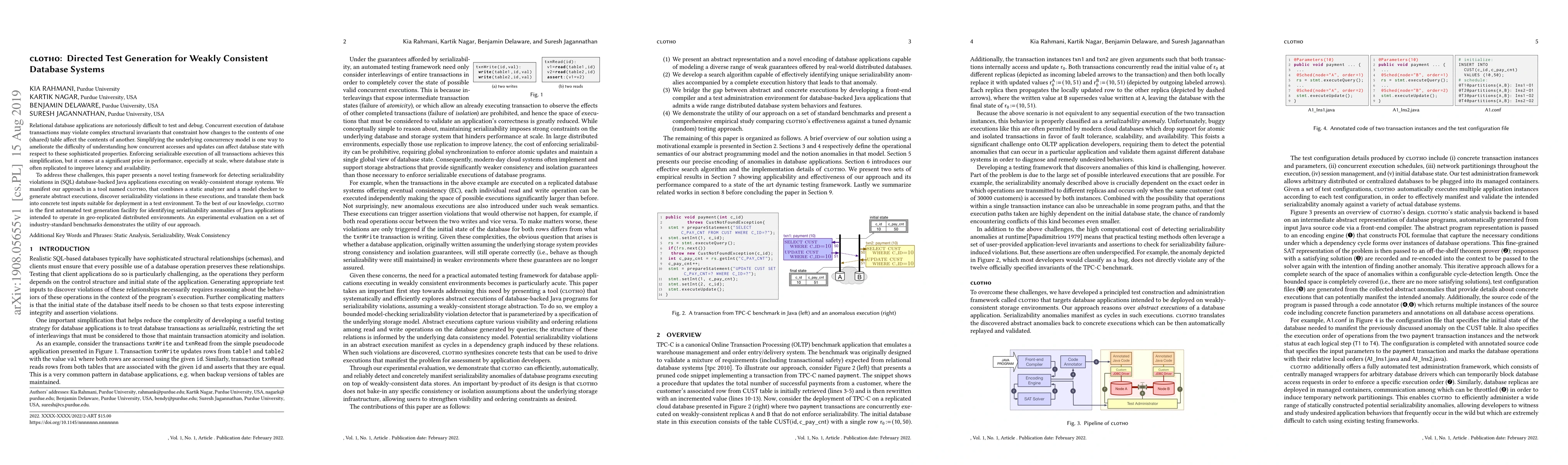 This paper introduces CLOTHO, a novel testing framework for detecting serializability violations in Java applications running on weakly-consistent storage systems. It combines static analysis and model checking to generate abstract executions, identify anomalies, and translate them into concrete test inputs, addressing the challenges of concurrency in distributed environments.