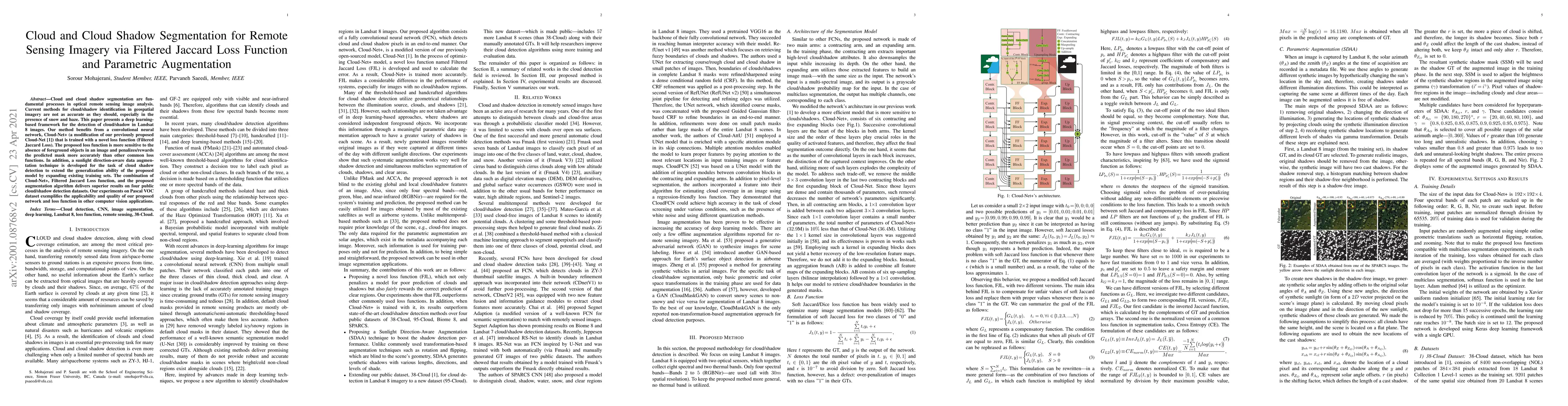 This paper introduces a deep learning-based framework, Cloud-Net+, for cloud and cloud shadow segmentation in Landsat 8 images, utilizing a novel Filtered Jaccard Loss function and a parametric augmentation technique to improve accuracy, especially in challenging conditions like snow and haze. The method demonstrates superior performance on multiple datasets.