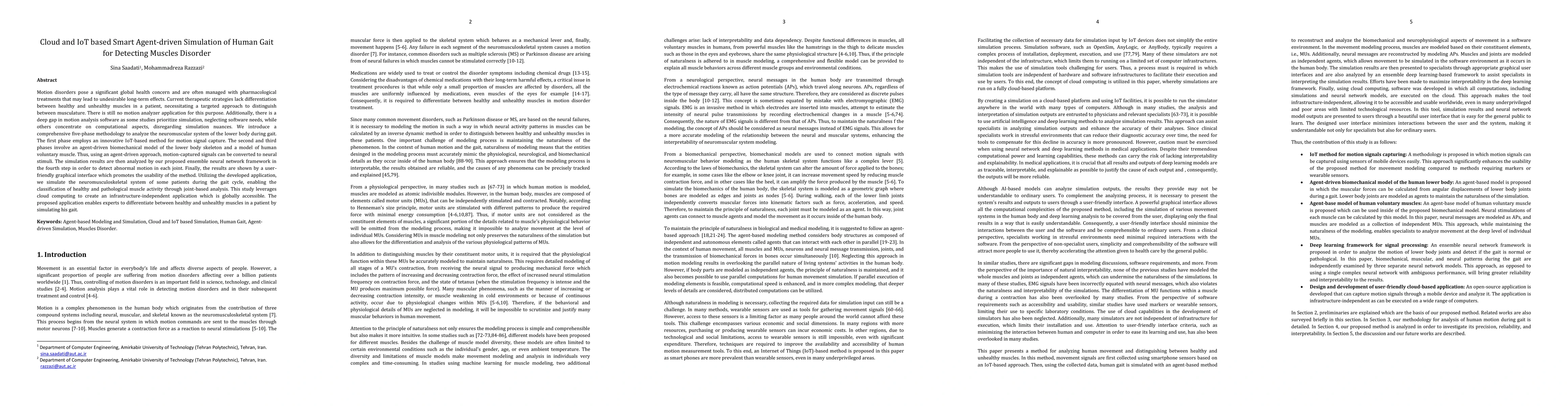 This research introduces a cloud and IoT-based smart agent-driven simulation system to analyze gait and detect neuromuscular disorders by distinguishing between healthy and unhealthy muscles using a five-phase methodology, and it presents a globally accessible, user-friendly application for expert analysis.
