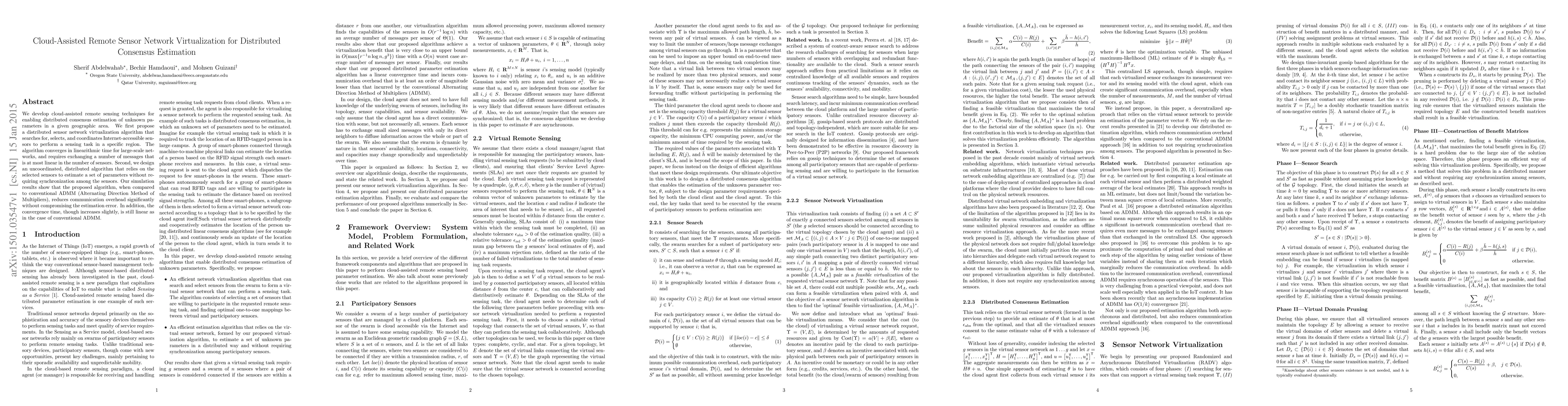 We develop cloud-assisted remote sensing techniques for enabling distributed consensus estimation of unknown parameters in a given geographic area. We first propose a distributed sensor network virtualization algorithm that searches for, selects, and coordinates Internet-accessible sensors to perform a sensing task in a specific region. The algorithm converges in linearithmic time for large-scale networks, and requires exchanging a number of messages that is at most linear in the number of sensors. Second, we design an uncoordinated, distributed algorithm that relies on the selected sensors to estimate a set of parameters without requiring synchronization among the sensors. Our simulation results show that the proposed algorithm, when compared to conventional ADMM (Alternating Direction Method of Multipliers), reduces communication overhead significantly without compromising the estimation error. In addition, the convergence time, though increases slightly, is still linear as in the case of conventional ADMM.