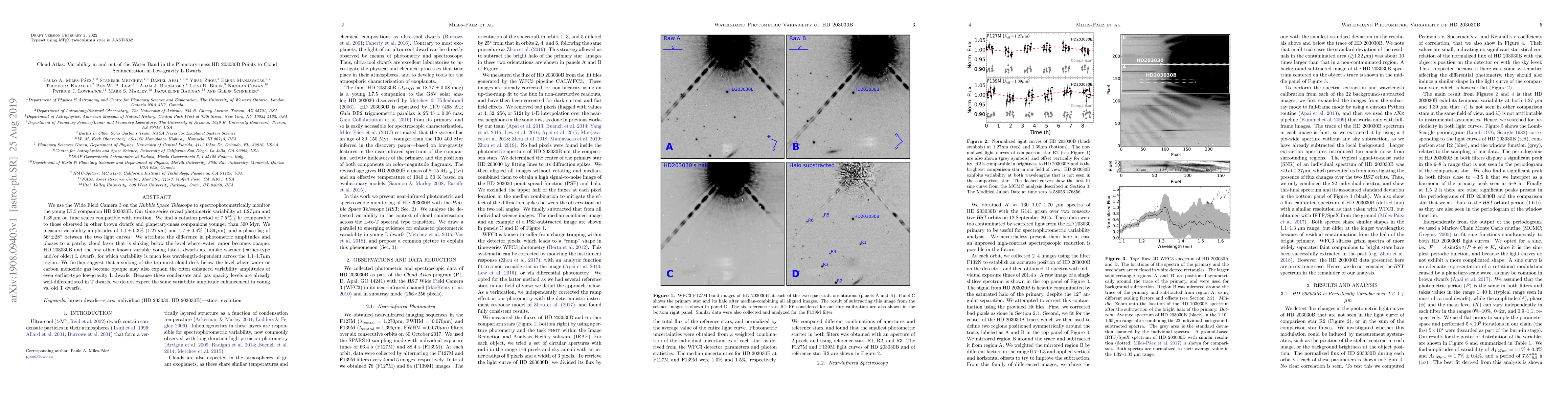We use the Wide Field Camera 3 on the {\sl Hubble Space Telescope} to spectrophotometrically monitor the young L7.5 companion HD~203030B. Our time series reveal photometric variability at 1.27\,$\mu$m and 1.39\,$\mu$m on time scales compatible with rotation. We find a rotation period of $7.5^{+0.6}_{-0.5}$ h: comparable to those observed in other brown dwarfs and planetary-mass companions younger than 300 Myr. We measure variability amplitudes of $1.1\pm0.3\%$ (1.27\,$\mu$m) and $1.7\pm0.4\%$ (1.39\,$\mu$m), and a phase lag of 56$^\circ\pm$28$^\circ$ between the two light curves. We attribute the difference in photometric amplitudes and phases to a patchy cloud layer that is sinking below the level where water vapor becomes opaque. HD 203030B and the few other known variable young late-L dwarfs are unlike warmer (earlier-type and/or older) L dwarfs, for which variability is much less wavelength-dependent across the 1.1--1.7$\mu$m region. We further suggest that a sinking of the top-most cloud deck below the level where water or carbon monoxide gas become opaque may also explain the often enhanced variability amplitudes of even earlier-type low-gravity L dwarfs. Because these condensate and gas opacity levels are already well-differentiated in T dwarfs, we do not expect the same variability amplitude enhancement in young vs.\ old T dwarfs.