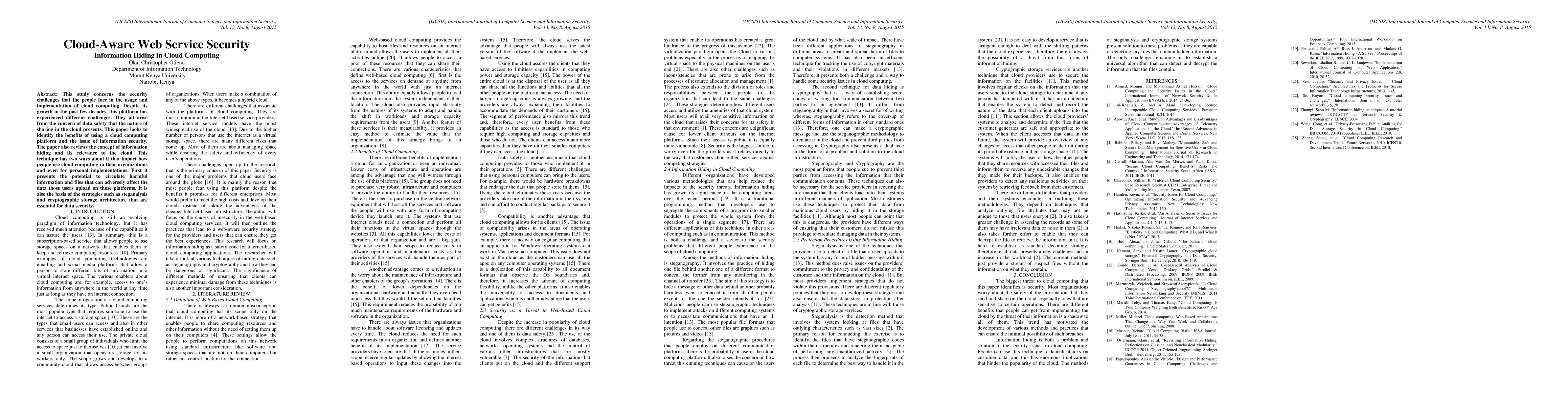 This paper explores the security challenges in cloud computing, focusing on data safety and information hiding techniques. It highlights the risks of circulating harmful information and the importance of steganalysis and cryptographic storage for enhancing data security.