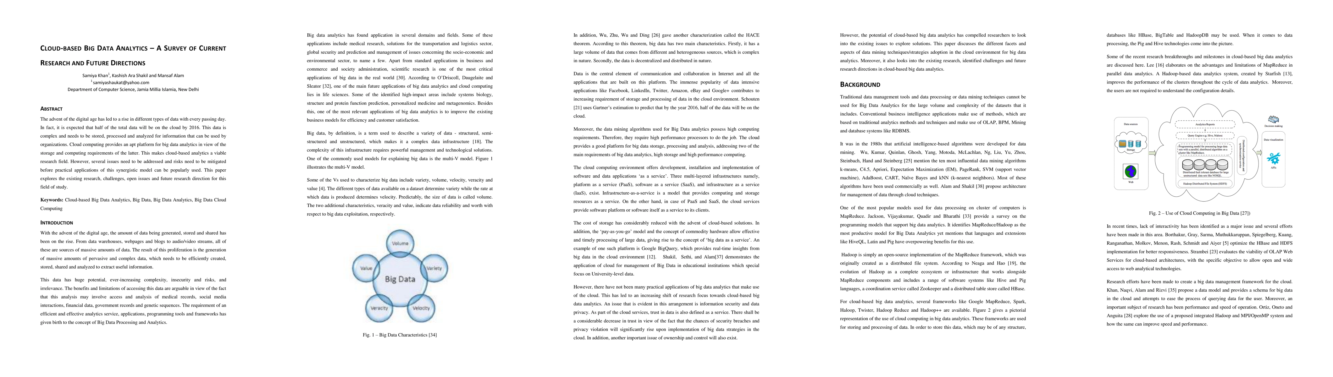 The advent of the digital age has led to a rise in different types of data with every passing day. In fact, it is expected that half of the total data will be on the cloud by 2016. This data is complex and needs to be stored, processed and analyzed for information that can be used by organizations. Cloud computing provides an apt platform for big data analytics in view of the storage and computing requirements of the latter. This makes cloud-based analytics a viable research field. However, several issues need to be addressed and risks need to be mitigated before practical applications of this synergistic model can be popularly used. This paper explores the existing research, challenges, open issues and future research direction for this field of study.