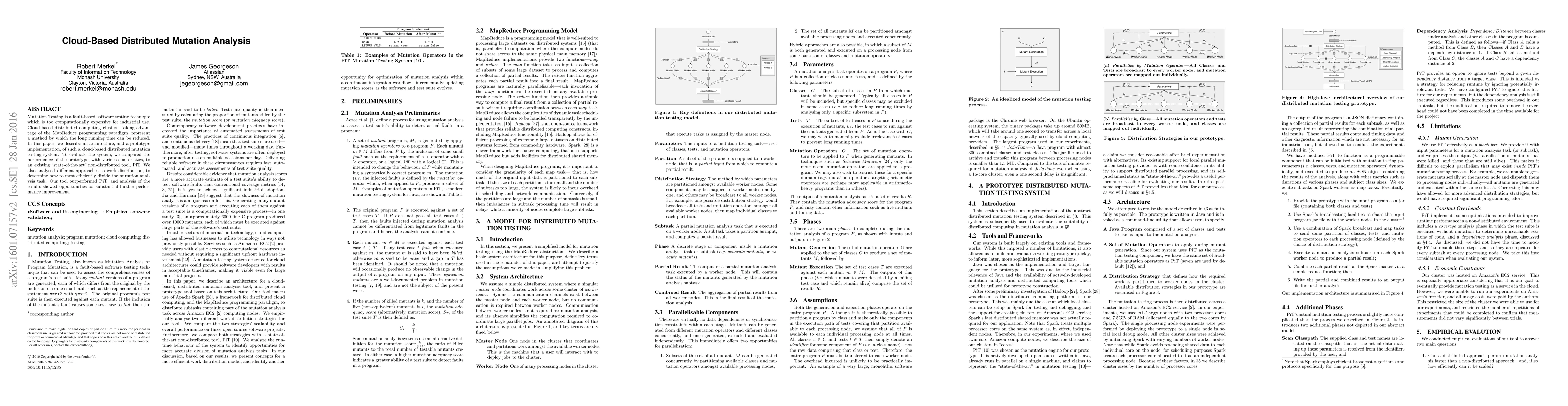 This paper presents a cloud-based distributed mutation analysis system leveraging MapReduce to reduce computational costs. The prototype outperformed a non-distributed tool, PiT, and analysis of work distribution revealed potential for further performance enhancements.