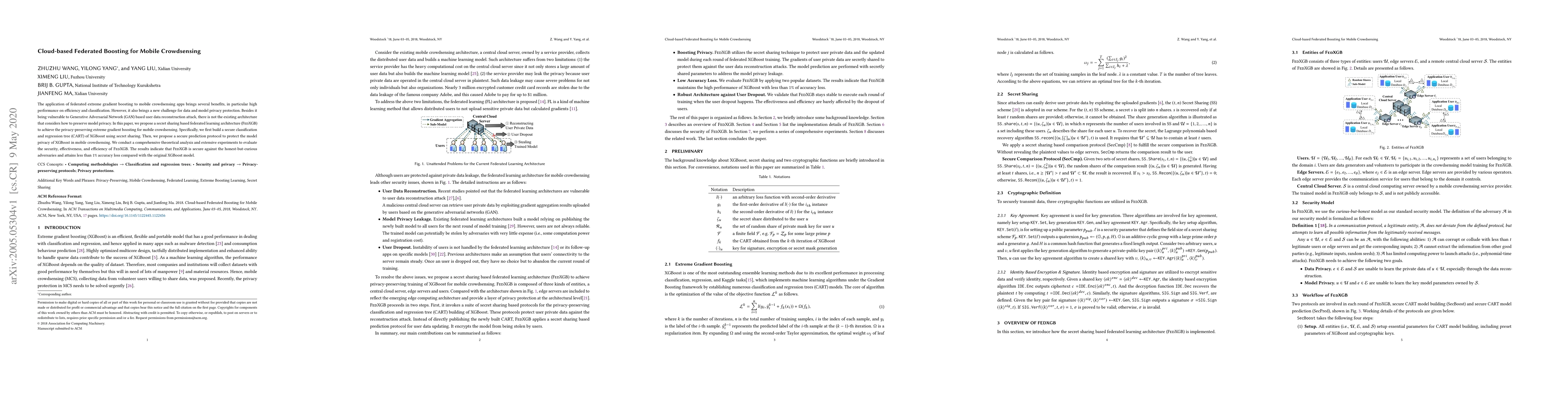 This paper proposes FedXGB, a secret sharing-based federated learning architecture for privacy-preserving extreme gradient boosting in mobile crowdsensing. FedXGB secures model privacy through a secure classification and regression tree of XGBoost and a secure prediction protocol, demonstrating high performance and minimal accuracy loss.