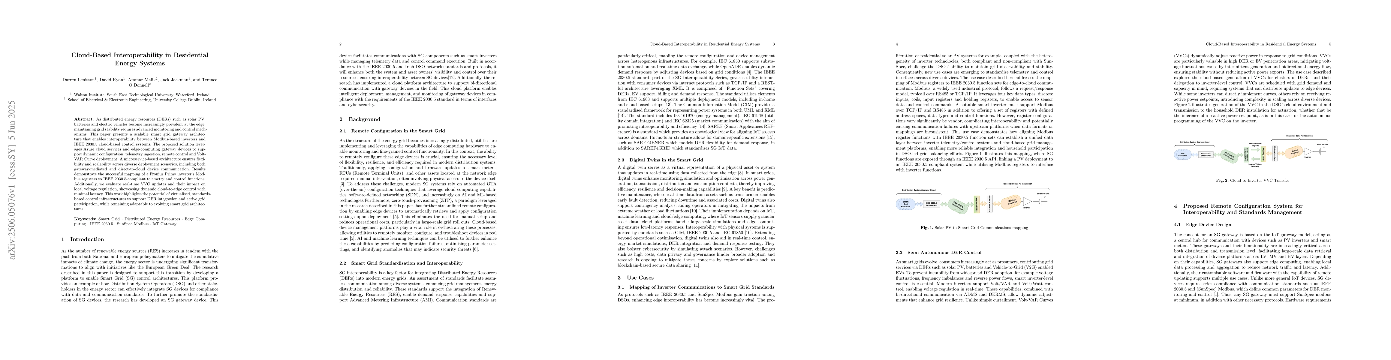 This work differentiates itself by focusing on cloud-based interoperability for diverse residential energy systems, utilizing Azure services and edge computing for dynamic configuration, telemetry ingestion, remote control, and Volt-VAR Curve deployment.
