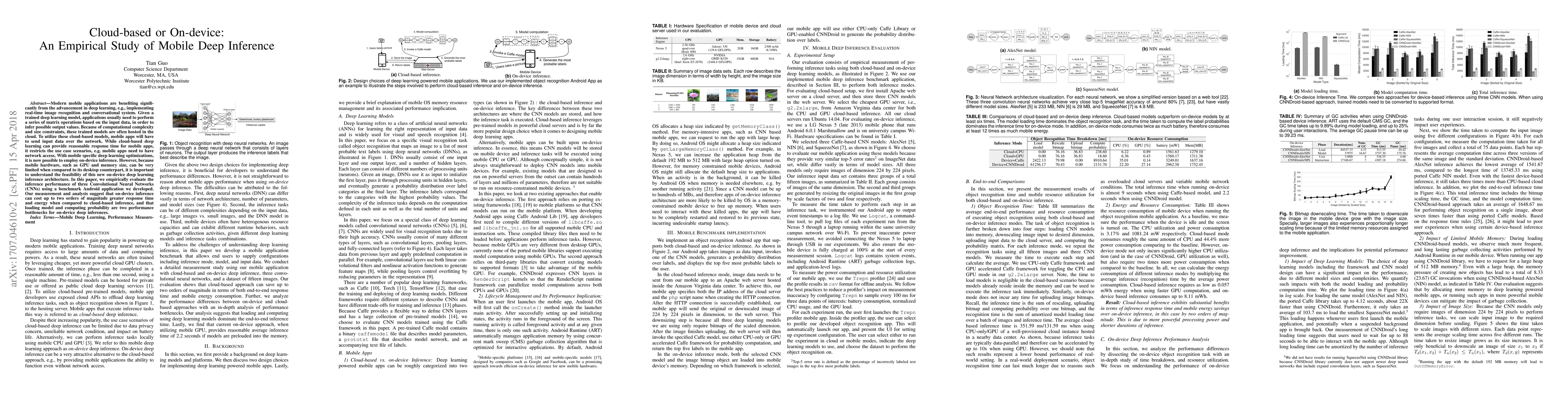 This paper empirically evaluates the performance of on-device versus cloud-based deep inference for mobile applications using three CNNs. The study finds that on-device inference is significantly slower and more energy-intensive, with model loading and probability computation being major bottlenecks.