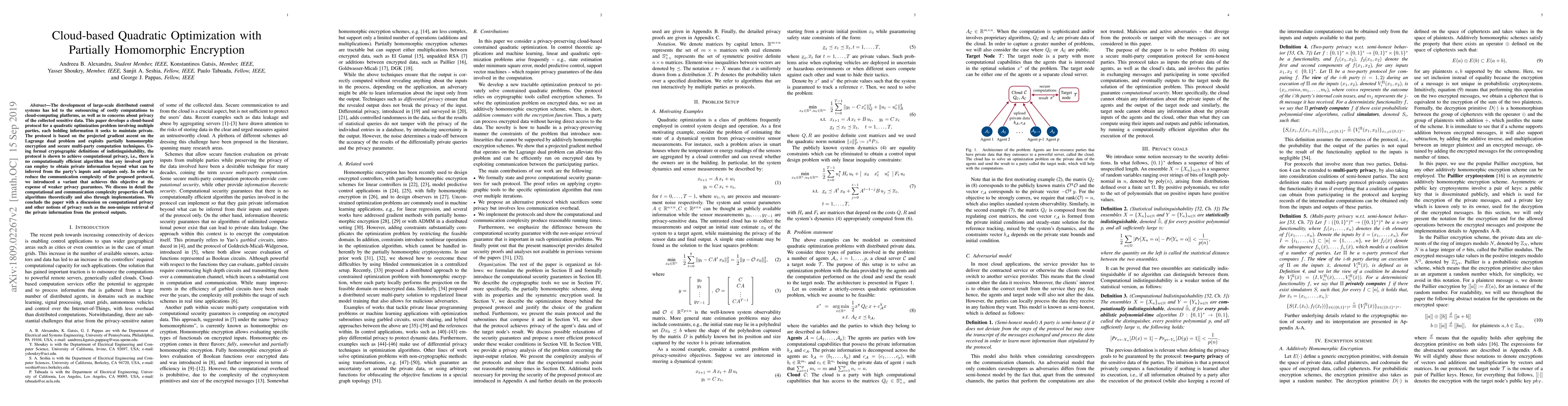 This paper proposes a cloud-based protocol for solving quadratic optimization problems among multiple private data holders using partially homomorphic encryption and secure multi-party computation. It achieves computational privacy while discussing variants with reduced communication complexity at the cost of weaker privacy guarantees.