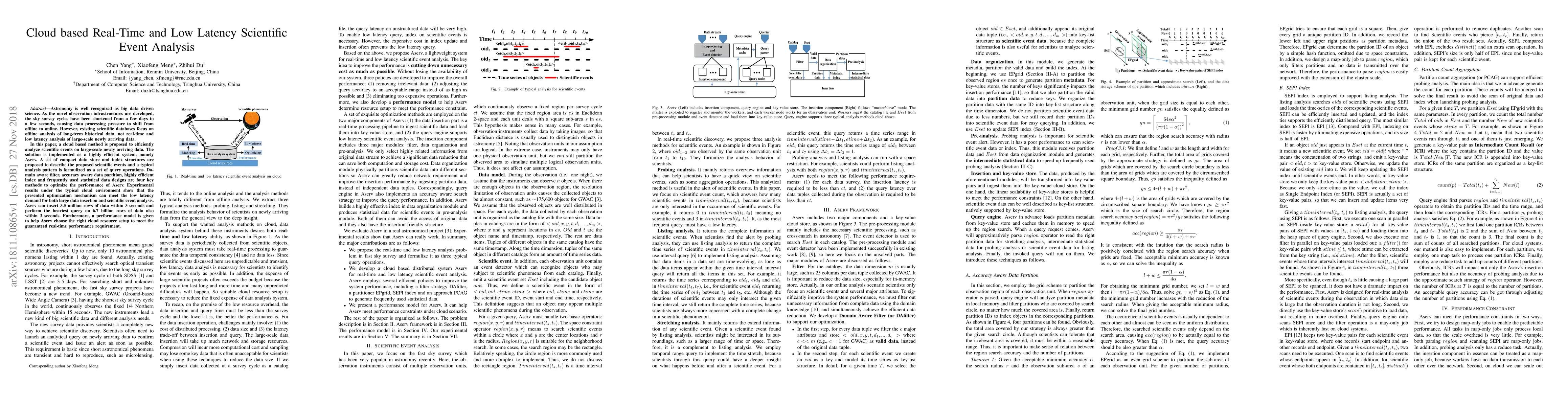 This paper proposes a cloud-based system, Aserv, for real-time and low latency analysis of large-scale scientific event data, addressing the shift from offline to online data processing in astronomy. The system employs optimized data structures, domain-aware filters, and efficient indexing to achieve high performance, demonstrated by handling 3.5 million rows in 3 seconds and processing 6.7 billion rows within the same timeframe.