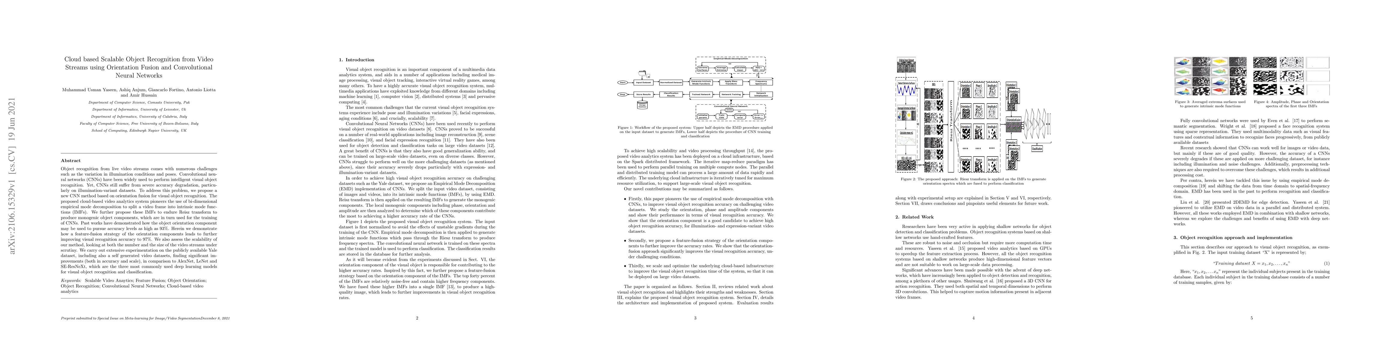 This paper proposes a cloud-based scalable object recognition system using orientation fusion and convolutional neural networks (CNNs) to improve recognition accuracy in video streams. The method employs bi-dimensional empirical mode decomposition and Reisz transform to enhance CNN training, achieving 97% accuracy and demonstrating scalability across various video datasets.