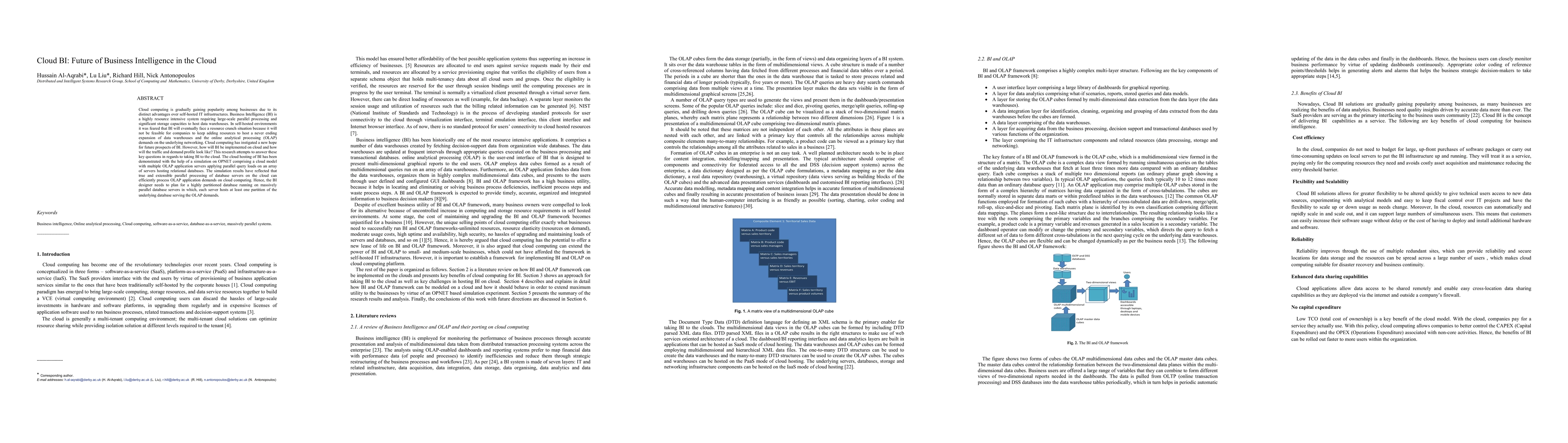 Cloud computing is gradually gaining popularity among businesses due to its distinct advantages over self-hosted IT infrastructures. Business Intelligence (BI) is a highly resource intensive system requiring large-scale parallel processing and significant storage capacities to host data warehouses. In self-hosted environments it was feared that BI will eventually face a resource crunch situation because it will not be feasible for companies to keep adding resources to host a neverending expansion of data warehouses and the online analytical processing (OLAP) demands on the underlying networking. Cloud computing has instigated a new hope for future prospects of BI. However, how will BI be implemented on cloud and how will the traffic and demand profile look like? This research attempts to answer these key questions in regards to taking BI to the cloud. The cloud hosting of BI has been demonstrated with the help of a simulation on OPNET comprising a cloud model with multiple OLAP application servers applying parallel query loads on an array of servers hosting relational databases. The simulation results have reflected that true and extensible parallel processing of database servers on the cloud can efficiently process OLAP application demands on cloud computing. Hence, the BI designer needs to plan for a highly partitioned database running on massively parallel database servers in which, each server hosts at least one partition of the underlying database serving the OLAP demands.