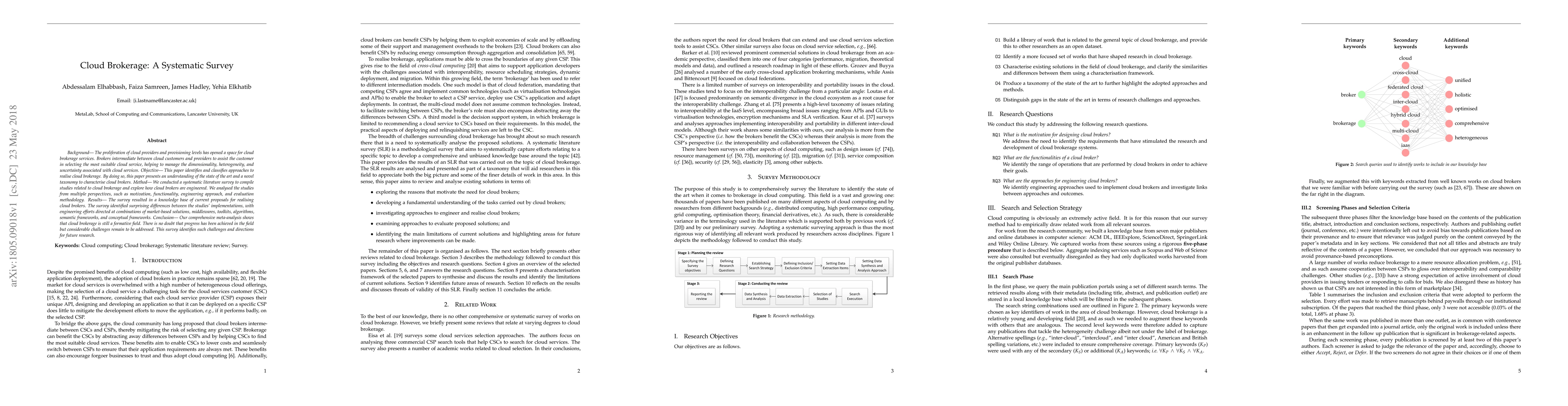Background: The proliferation of cloud providers and provisioning levels has opened a space for cloud brokerage services. Brokers intermediate between cloud customers and providers to assist the customer in selecting the most suitable cloud service, helping to manage the dimensionality, heterogeneity, and uncertainty associated with cloud services. Objective: This paper identifies and classifies approaches to realise cloud brokerage. By doing so, this paper presents an understanding of the state of the art and a novel taxonomy to characterise cloud brokers. Method: We conducted a systematic literature survey to compile studies related to cloud brokerage and explore how cloud brokers are engineered. We analysed the studies from multiple perspectives, such as motivation, functionality, engineering approach, and evaluation methodology. Results: The survey resulted in a knowledge base of current proposals for realising cloud brokers. The survey identified surprising differences between the studies' implementations, with engineering efforts directed at combinations of market-based solutions, middlewares, toolkits, algorithms, semantic frameworks, and conceptual frameworks. Conclusion: Our comprehensive meta-analysis shows that cloud brokerage is still a formative field. There is no doubt that progress has been achieved in the field but considerable challenges remain to be addressed. This survey identifies such challenges and directions for future research.