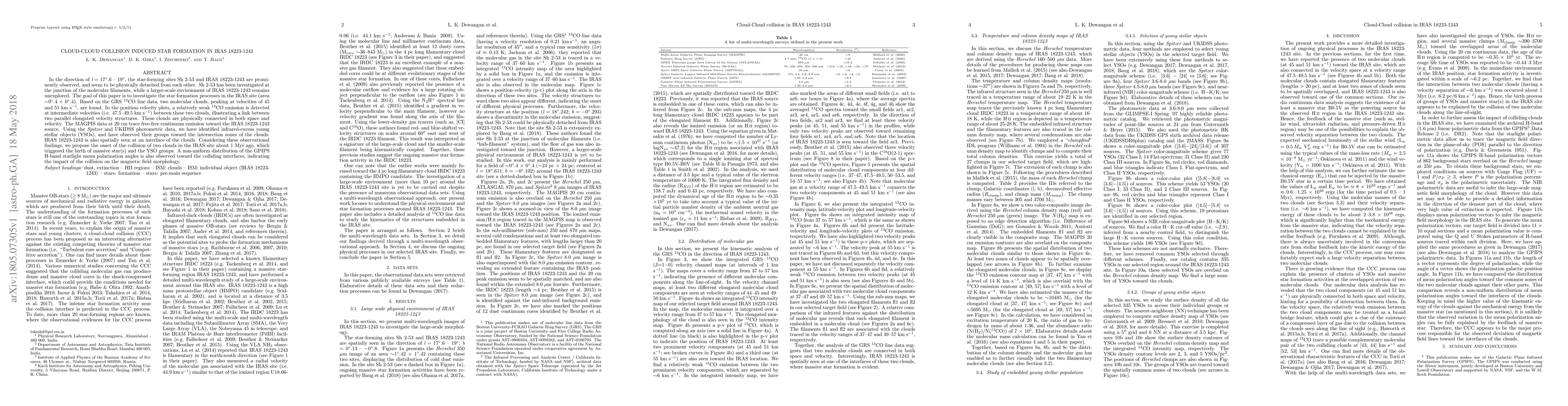 In the direction of l = 17.6 - 19 deg, the star-forming sites Sh 2-53 and IRAS 18223-1243 are prominently observed, and seem to be physically detached from each other. Sh 2-53 has been investigated at the junction of the molecular filaments, while a larger-scale environment of IRAS 18223-1243 remains unexplored. The goal of this paper is to investigate the star formation processes in the IRAS site (area ~0.4 deg x 0.4 deg). Based on the GRS 13CO line data, two molecular clouds, peaking at velocities of 45 and 51 km/s, are found. In the position-velocity plots, a relatively weak 13CO emission is detected at intermediate velocities (i.e. 47.5 - 49.5 km/s) between these two clouds, illustrating a link between two parallel elongated velocity structures. These clouds are physically connected in both space and velocity. The MAGPIS data at 20 cm trace free-free continuum emission toward the IRAS 18223-1243 source. Using the Spitzer and UKIDSS photometric data, we have identified infrared-excess young stellar objects (YSOs), and have observed their groups toward the intersection zones of the clouds. IRAS 18223-1243 is also spatially seen at an interface of the clouds. Considering these observational findings, we propose the onset of the collision of two clouds in the IRAS site about 1 Myr ago, which triggered the birth of massive star(s) and the YSO groups. A non-uniform distribution of the GPIPS H-band starlight mean polarization angles is also observed toward the colliding interfaces, indicating the impact of the collision on the magnetic field morphology.