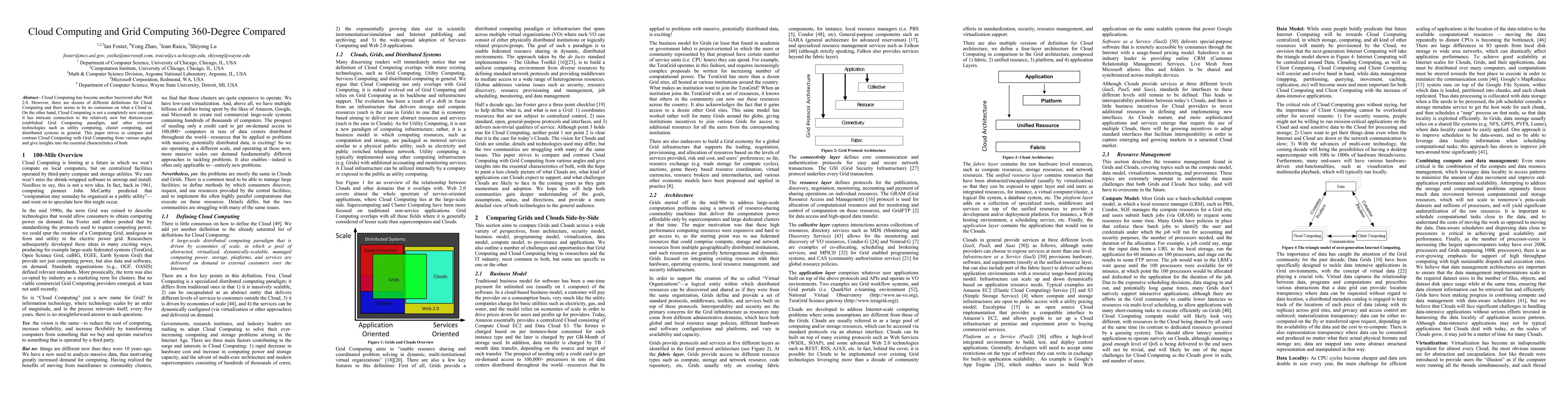 Cloud Computing has become another buzzword after Web 2.0. However, there are dozens of different definitions for Cloud Computing and there seems to be no consensus on what a Cloud is. On the other hand, Cloud Computing is not a completely new concept; it has intricate connection to the relatively new but thirteen-year established Grid Computing paradigm, and other relevant technologies such as utility computing, cluster computing, and distributed systems in general. This paper strives to compare and contrast Cloud Computing with Grid Computing from various angles and give insights into the essential characteristics of both.