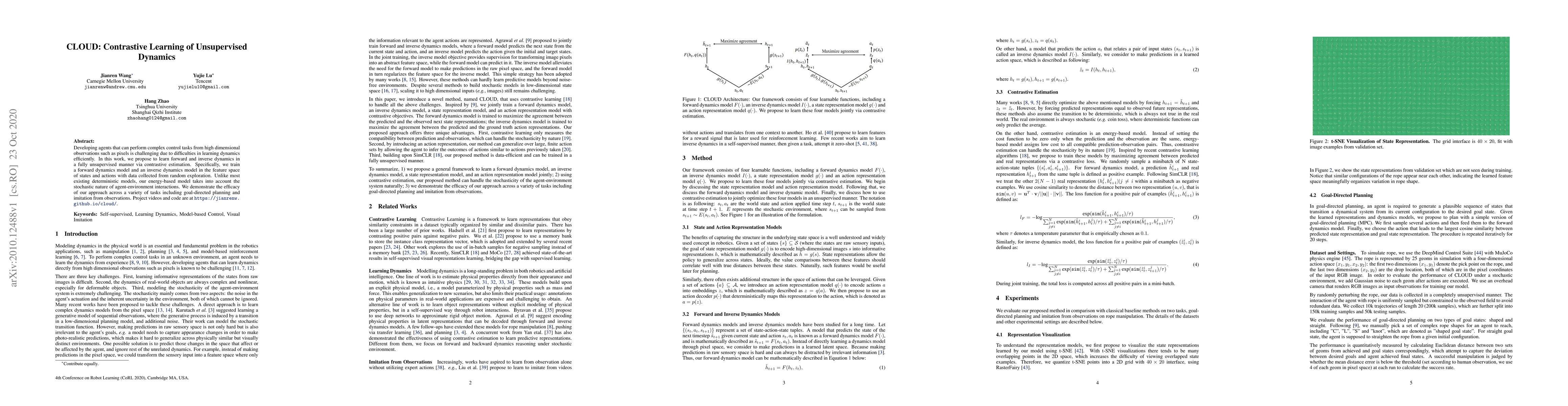 Developing agents that can perform complex control tasks from high dimensional observations such as pixels is challenging due to difficulties in learning dynamics efficiently. In this work, we propose to learn forward and inverse dynamics in a fully unsupervised manner via contrastive estimation. Specifically, we train a forward dynamics model and an inverse dynamics model in the feature space of states and actions with data collected from random exploration. Unlike most existing deterministic models, our energy-based model takes into account the stochastic nature of agent-environment interactions. We demonstrate the efficacy of our approach across a variety of tasks including goal-directed planning and imitation from observations. Project videos and code are at https://jianrenw.github.io/cloud/.