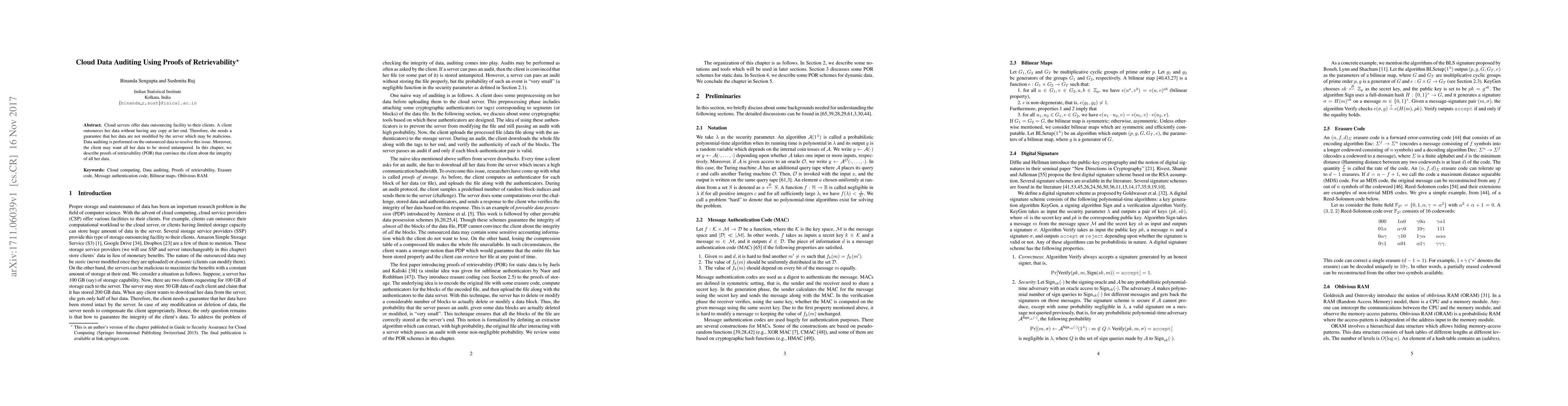 Cloud servers offer data outsourcing facility to their clients. A client outsources her data without having any copy at her end. Therefore, she needs a guarantee that her data are not modified by the server which may be malicious. Data auditing is performed on the outsourced data to resolve this issue. Moreover, the client may want all her data to be stored untampered. In this chapter, we describe proofs of retrievability (POR) that convince the client about the integrity of all her data.