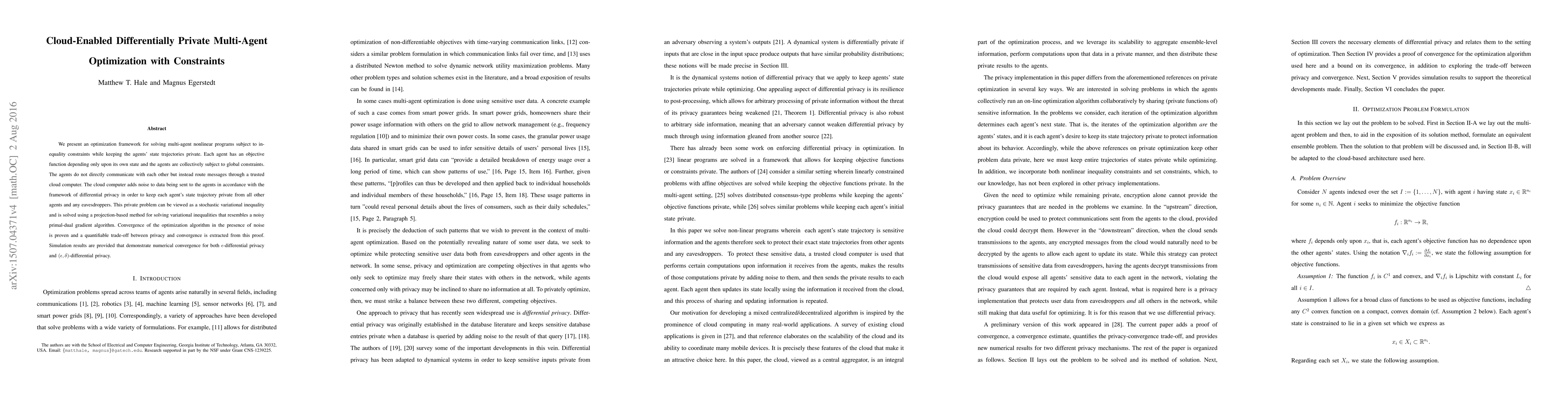 Researchers developed an optimization framework to solve multi-agent problems while maintaining individual agent privacy through cloud-based differential privacy mechanisms. The framework achieves a trade-off between privacy and convergence rates, enabling numerical solutions for both ε-differential privacy and (ε, ϗ)-differential privacy scenarios.