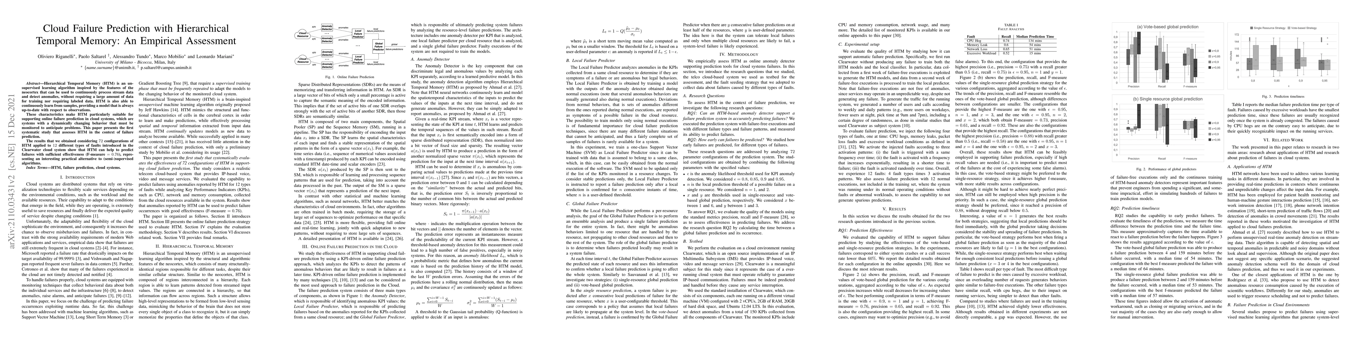 This paper evaluates Hierarchical Temporal Memory (HTM) for predicting failures in cloud systems, demonstrating its effectiveness with an F-measure of 0.76 across 12 fault types in the Clearwater cloud system. HTM's unsupervised learning and continuous updating capabilities make it a promising alternative to traditional supervised algorithms.