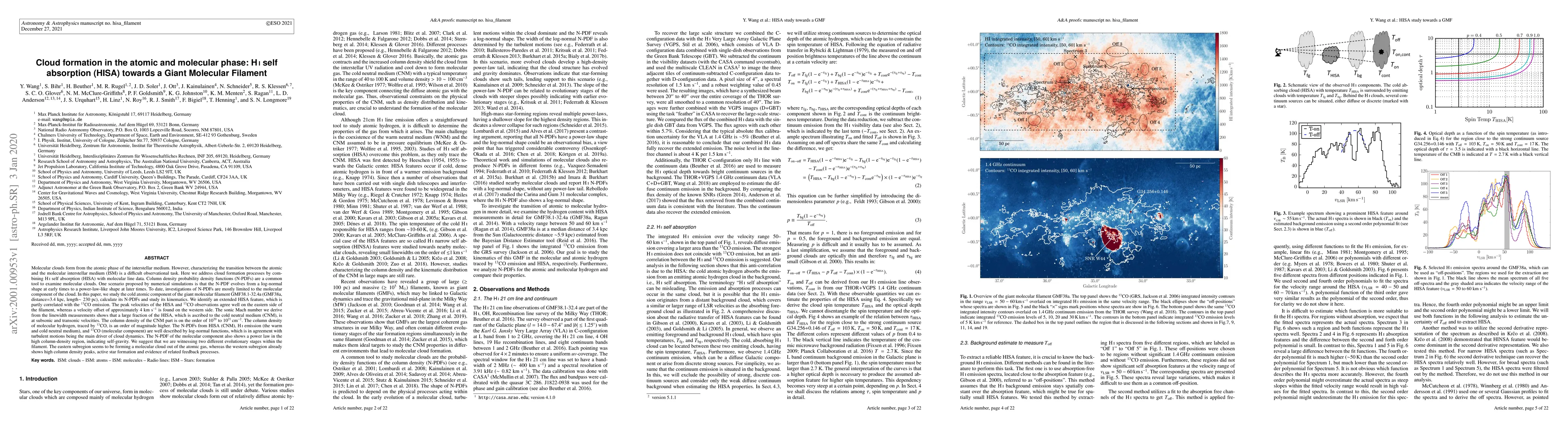 Molecular clouds form from the atomic phase of the interstellar medium. However, characterizing the transition between the atomic and the molecular interstellar medium (ISM) is a difficult observational task. Here we address cloud formation processes by combining HSIA with molecular line data. One scenario proposed by numerical simulations is that the column density probability density functions (N-PDF) evolves from a log-normal shape at early times to a power-law-like shape at later times. In this paper, we study the cold atomic component of the giant molecular filament GMF38a (d=3.4 kpc, length$\sim230$ pc). We identify an extended HISA feature, which is partly correlated with the 13CO emission. The peak velocities of the HISA and 13CO observations agree well on the eastern side of the filament, whereas a velocity offset of approximately 4 km s$^{-1}$ is found on the western side. The sonic Mach number we derive from the linewidth measurements shows that a large fraction of the HISA, which is ascribed to the cold neutral medium (CNM), is at subsonic and transonic velocities. The column density of the CNM is on the order of 10$^{20}$ to 10$^{21}$ cm$^{-2}$. The column density of molecular hydrogen is an order of magnitude higher. The N-PDFs from HISA (CNM), HI emission (WNM+CNM), and 13CO (molecular component) are well described by log-normal functions, which is in agreement with turbulent motions being the main driver of cloud dynamics. The N-PDF of the molecular component also shows a power law in the high column-density region, indicating self-gravity. We suggest that we are witnessing two different evolutionary stages within the filament. The eastern subregion seems to be forming a molecular cloud out of the atomic gas, whereas the western subregion already shows high column density peaks, active star formation and evidence of related feedback processes.