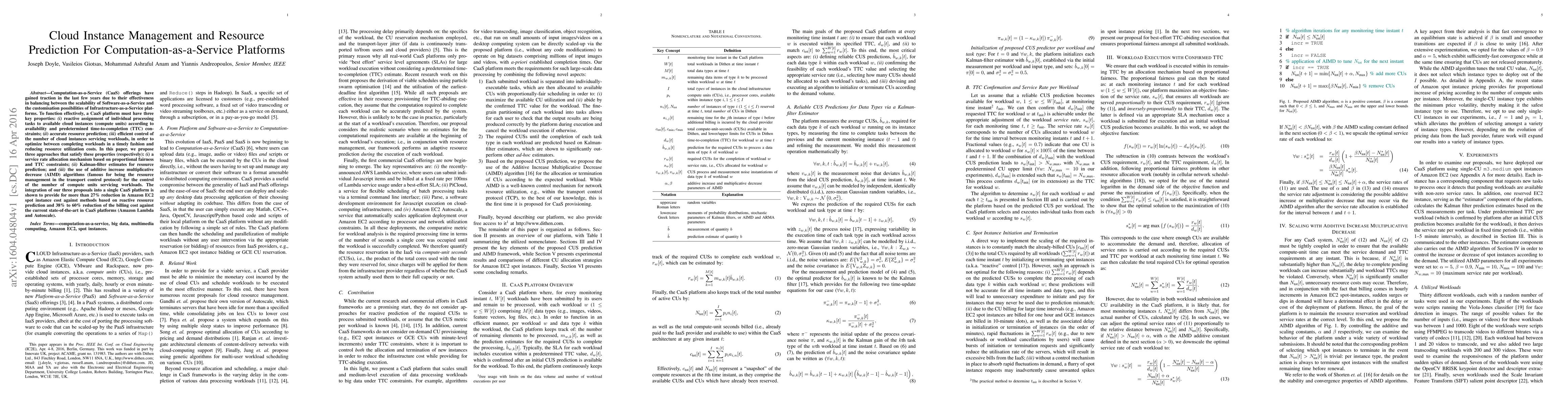 This paper proposes three approaches for managing cloud instances and predicting resources in Computation-as-a-Service (CaaS) platforms, achieving significant cost reductions. The approaches include a service rate allocation mechanism, Kalman-filter estimates, and AIMD algorithms, leading to over 27% reduction in Amazon EC2 spot instance costs and 38% to 60% reduction in billing costs compared to existing methods.