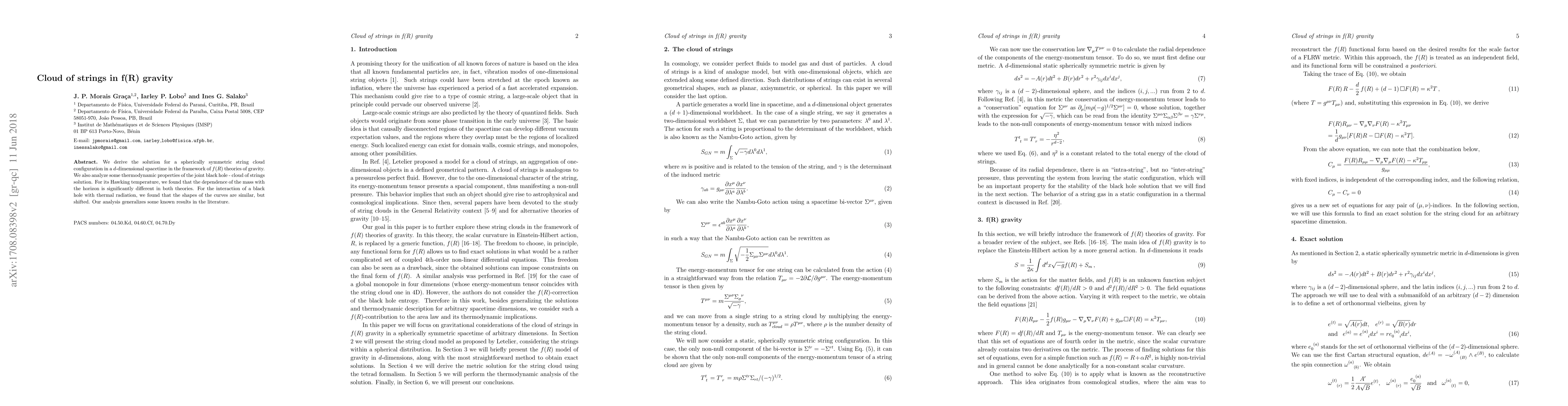 The paper derives solutions for a string cloud in f(R) gravity in d-dimensional spacetime, analyzing thermodynamic properties. It finds distinct mass-horizon dependencies and similar but shifted interaction curves with thermal radiation, compared to standard theories. This generalizes existing results.