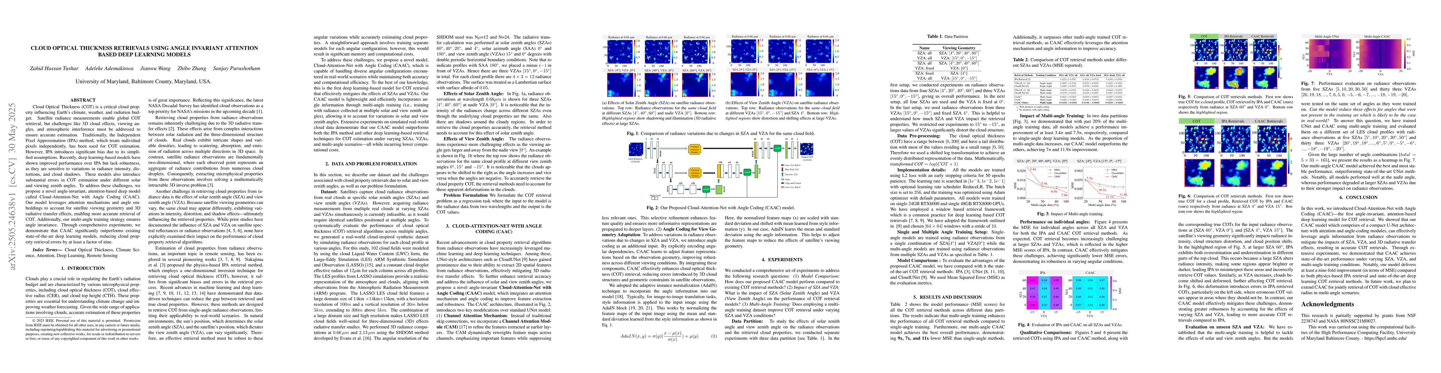 Cloud Optical Thickness (COT) is a critical cloud property influencing Earth's climate, weather, and radiation budget. Satellite radiance measurements enable global COT retrieval, but challenges like 3D cloud effects, viewing angles, and atmospheric interference must be addressed to ensure accurate estimation. Traditionally, the Independent Pixel Approximation (IPA) method, which treats individual pixels independently, has been used for COT estimation. However, IPA introduces significant bias due to its simplified assumptions. Recently, deep learning-based models have shown improved performance over IPA but lack robustness, as they are sensitive to variations in radiance intensity, distortions, and cloud shadows. These models also introduce substantial errors in COT estimation under different solar and viewing zenith angles. To address these challenges, we propose a novel angle-invariant, attention-based deep model called Cloud-Attention-Net with Angle Coding (CAAC). Our model leverages attention mechanisms and angle embeddings to account for satellite viewing geometry and 3D radiative transfer effects, enabling more accurate retrieval of COT. Additionally, our multi-angle training strategy ensures angle invariance. Through comprehensive experiments, we demonstrate that CAAC significantly outperforms existing state-of-the-art deep learning models, reducing cloud property retrieval errors by at least a factor of nine.