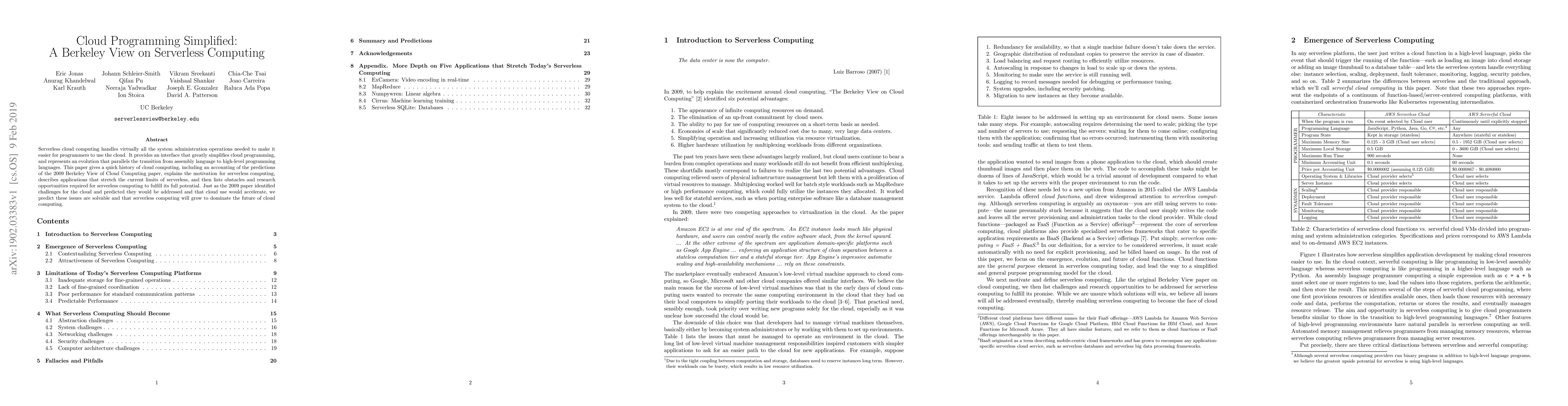 Serverless cloud computing handles virtually all the system administration operations needed to make it easier for programmers to use the cloud. It provides an interface that greatly simplifies cloud programming, and represents an evolution that parallels the transition from assembly language to high-level programming languages. This paper gives a quick history of cloud computing, including an accounting of the predictions of the 2009 Berkeley View of Cloud Computing paper, explains the motivation for serverless computing, describes applications that stretch the current limits of serverless, and then lists obstacles and research opportunities required for serverless computing to fulfill its full potential. Just as the 2009 paper identified challenges for the cloud and predicted they would be addressed and that cloud use would accelerate, we predict these issues are solvable and that serverless computing will grow to dominate the future of cloud computing.