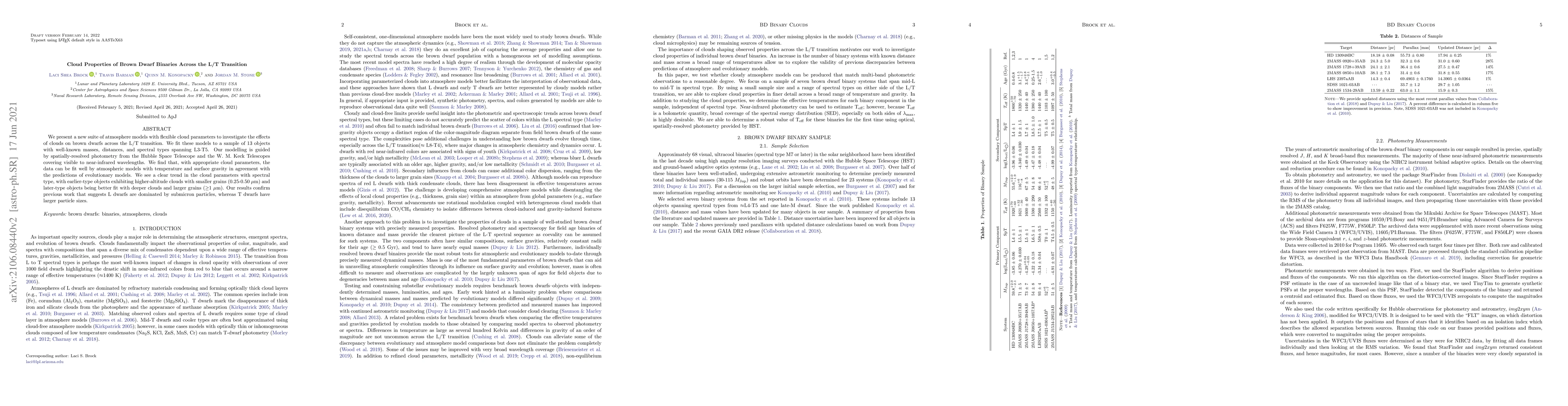 We present a new suite of atmosphere models with flexible cloud parameters to investigate the effects of clouds on brown dwarfs across the L/T transition. We fit these models to a sample of 13 objects with well-known masses, distances, and spectral types spanning L3-T5. Our modelling is guided by spatially-resolved photometry from the Hubble Space Telescope and the W. M. Keck Telescopes covering visible to near-infrared wavelengths. We find that, with appropriate cloud parameters, the data can be fit well by atmospheric models with temperature and surface gravity in agreement with the predictions of evolutionary models. We see a clear trend in the cloud parameters with spectral type, with earlier-type objects exhibiting higher-altitude clouds with smaller grains (0.25-0.50 micron) and later-type objects being better fit with deeper clouds and larger grains ($\geq$1 micron). Our results confirm previous work that suggests L dwarfs are dominated by submicron particles, whereas T dwarfs have larger particle sizes.