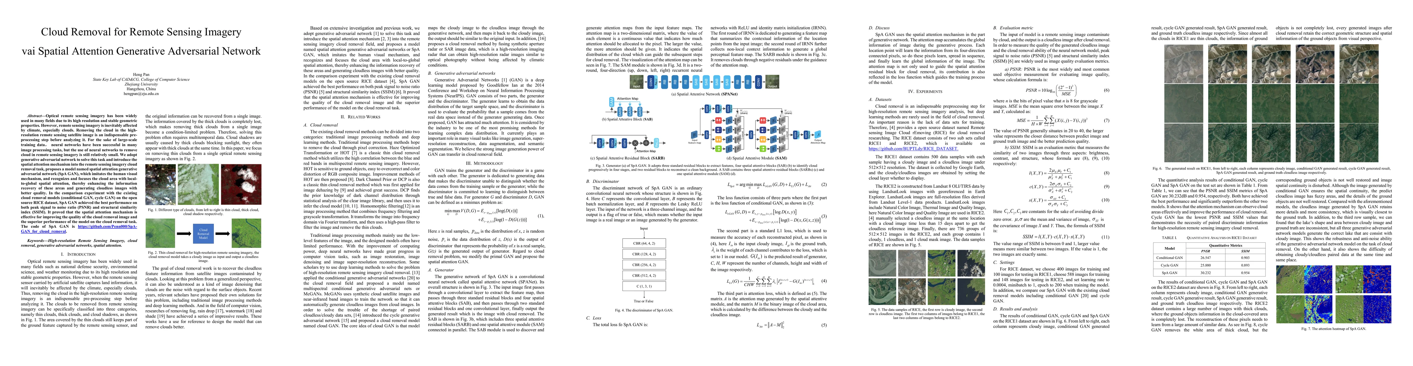 This paper proposes a spatial attention generative adversarial network (SpA GAN) to remove clouds from high-resolution remote sensing imagery. The model incorporates spatial attention to focus on cloud areas, improving the quality of cloudless images by enhancing information recovery.