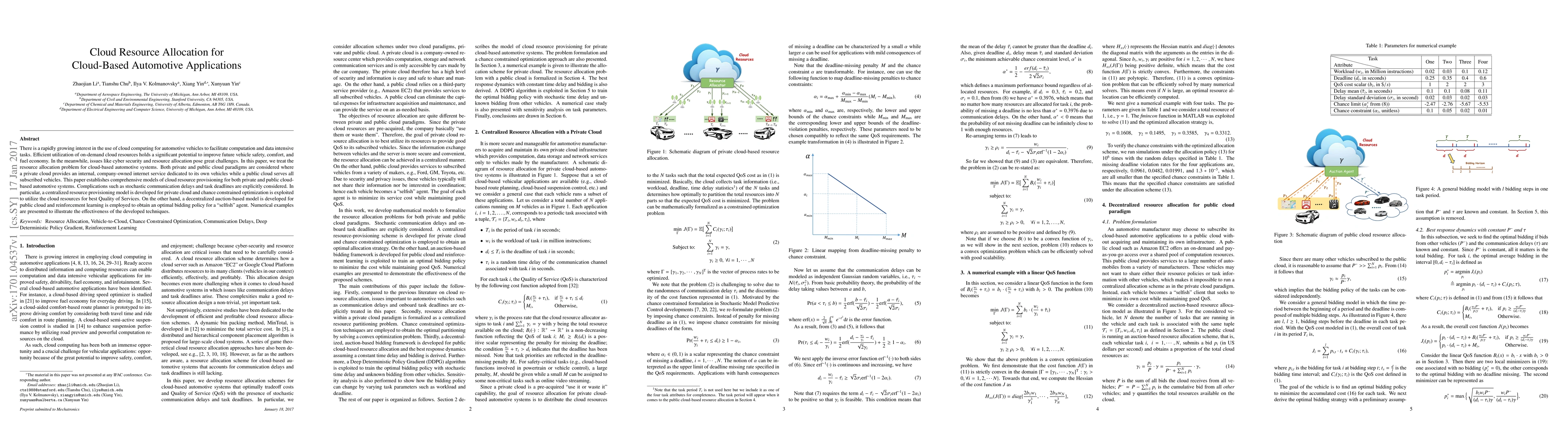 This paper develops models for cloud resource allocation in automotive systems, considering both private and public clouds to improve vehicle safety and efficiency. It proposes centralized and decentralized approaches using optimization and reinforcement learning to optimize resource utilization and quality of services.