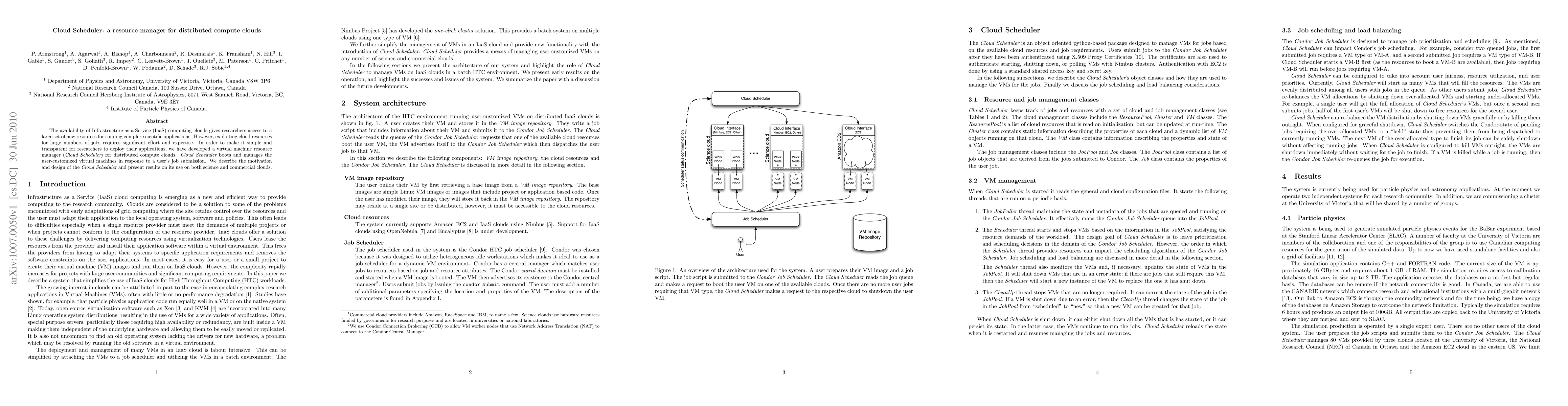 The Cloud Scheduler is a resource manager designed to simplify the deployment of complex scientific applications on distributed compute clouds. It automates the booting and management of user-customized virtual machines, reducing the effort required for researchers to exploit cloud resources.