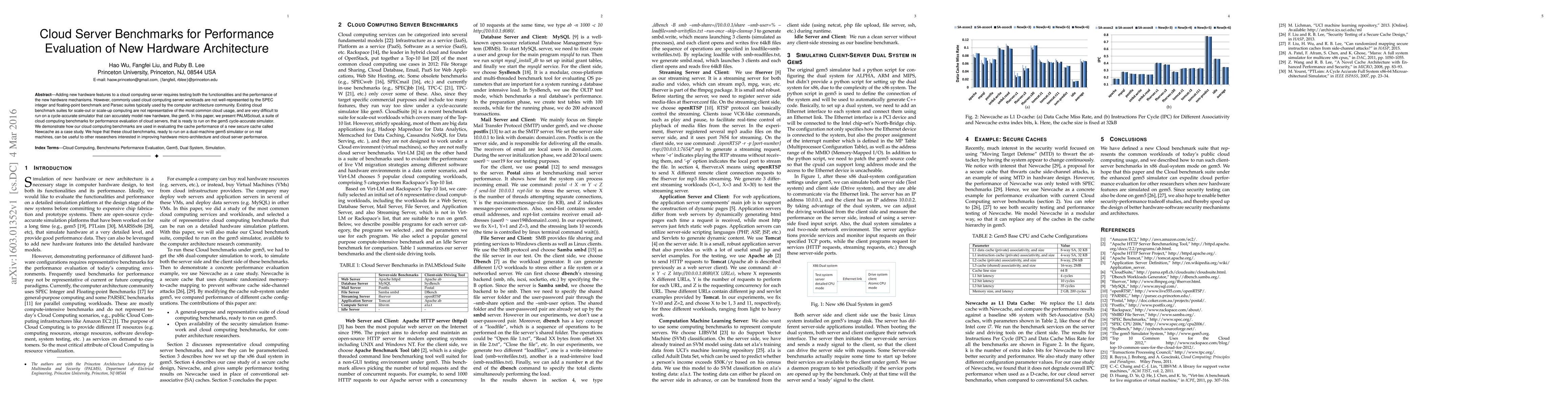 This paper introduces PALMScloud, a new suite of cloud computing benchmarks designed for performance evaluation of cloud servers, specifically tailored to run on the gem5 simulator. The authors demonstrate its utility by evaluating the cache performance of a new secure cache, Newcache, and aim to provide a useful tool for researchers enhancing hardware micro-architecture and cloud server performance.