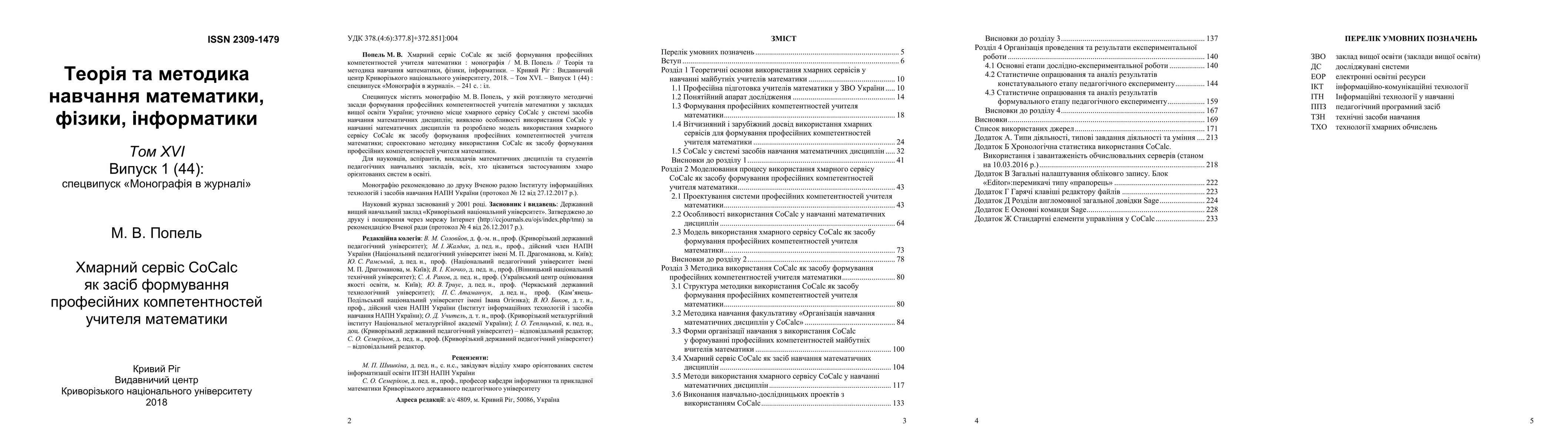 The special issue contains a monograph by M. Popel, in which the methodical foundations of the formation of professional competences of mathematics teachers in institutions of higher education of Ukraine are considered; the place of cloud service CoCalc in the system of teaching mathematical disciplines is specified; the features of CoCalc use in teaching mathematical disciplines were discovered and the model of use of cloud service CoCalc as a means of formation of professional competences of mathematics teacher was developed; The method of using CoCalc as a means of forming the professional competencies of the mathematics teacher is designed. For scientists, postgraduates, teachers of mathematical disciplines and students of pedagogical educational institutions, all who are interested in the application of cloud-oriented systems in education.