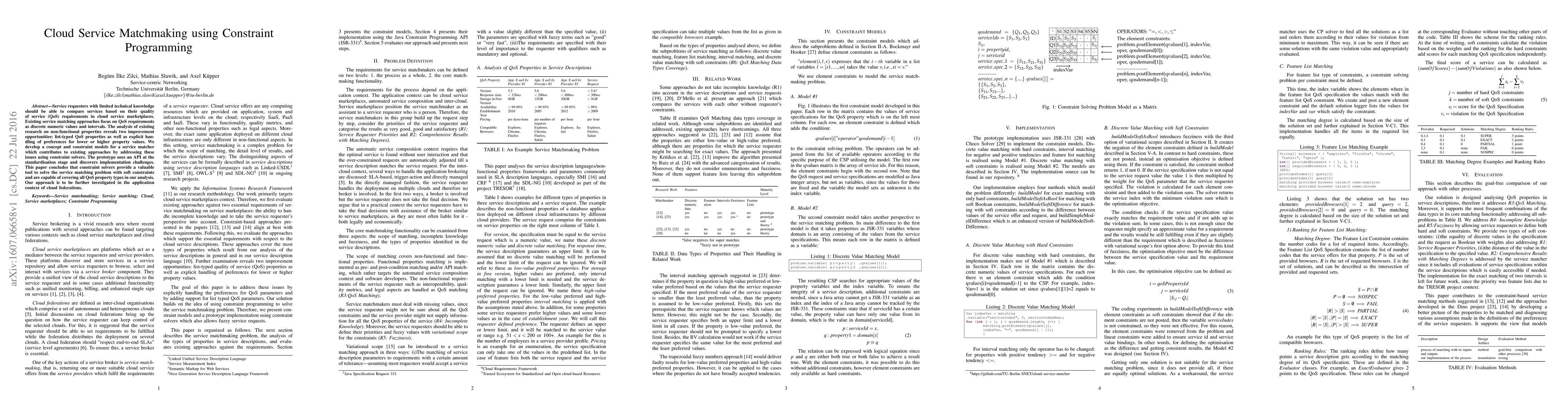 This paper proposes a novel service matchmaking concept using constraint programming to address QoS requirements in cloud service marketplaces. The approach improves existing methods by handling list-typed QoS properties and preferences, demonstrating its potential through a prototype API and identifying implementation challenges.