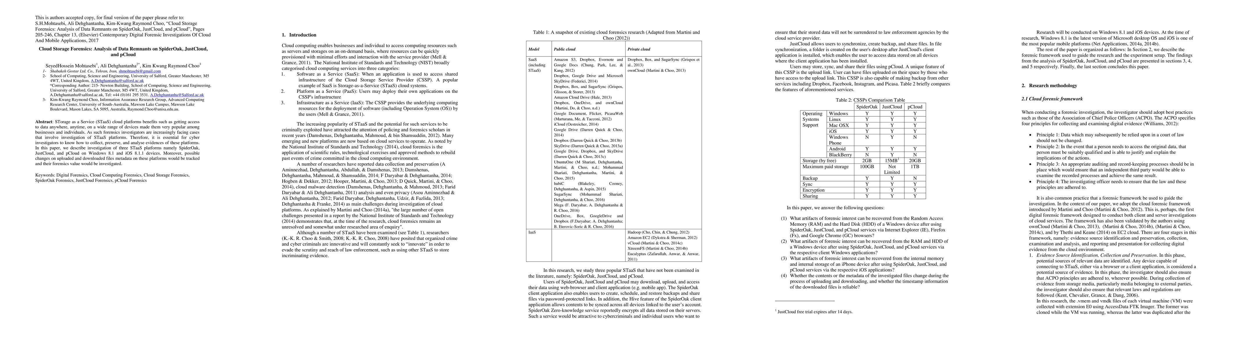 This paper investigates the forensic analysis of data remnants on three cloud storage platforms—SpiderOak, JustCloud, and pCloud—on Windows 8.1 and iOS 8.1.1 devices. It examines the metadata changes of uploaded and downloaded files to assess their forensic value for cyber investigators.
