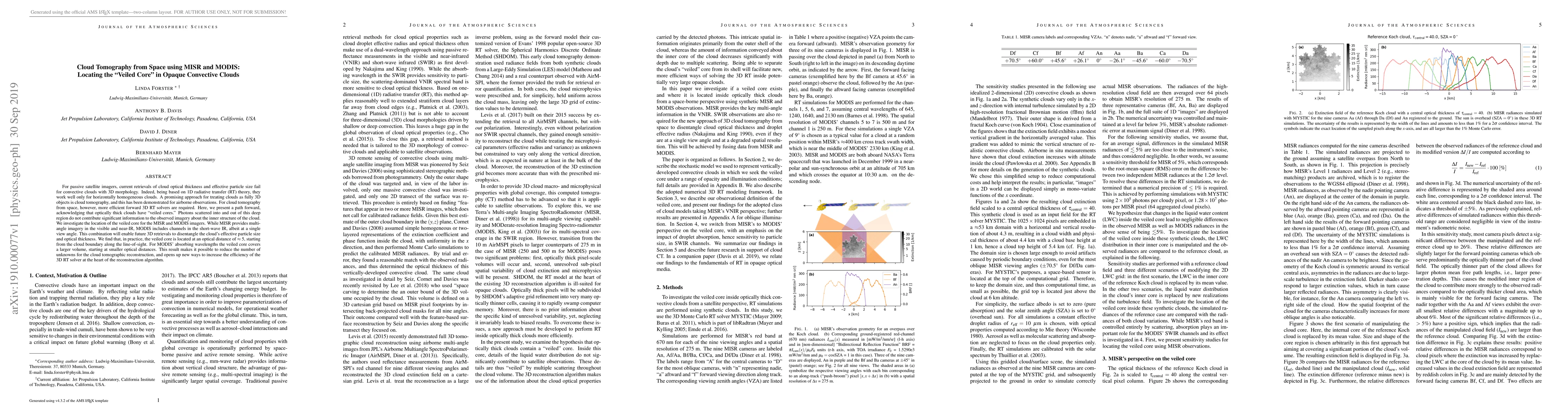 This paper proposes a method for cloud tomography from space using MISR and MODIS data to locate the "veiled core" in opaque convective clouds, where scattered photons do not provide significant information about the inner cloud structure. The study finds that the veiled core starts at an optical distance of approximately 5 from the cloud boundary, which can help reduce the number of unknowns in cloud tomographic reconstructions and improve the efficiency of the 3D radiative transfer solver used.