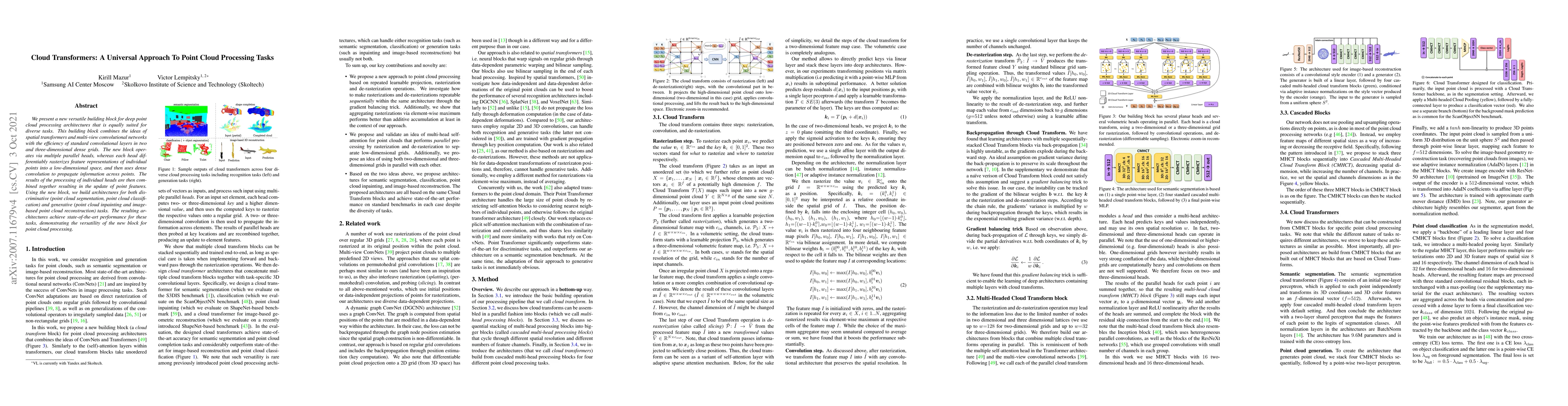 This paper introduces a novel deep learning block called Cloud Transformers that integrates spatial transformers and multi-view convolutional networks for efficient point cloud processing. The block uses parallel heads to rasterize and propagate point features, achieving state-of-the-art results in both discriminative and generative point cloud tasks.