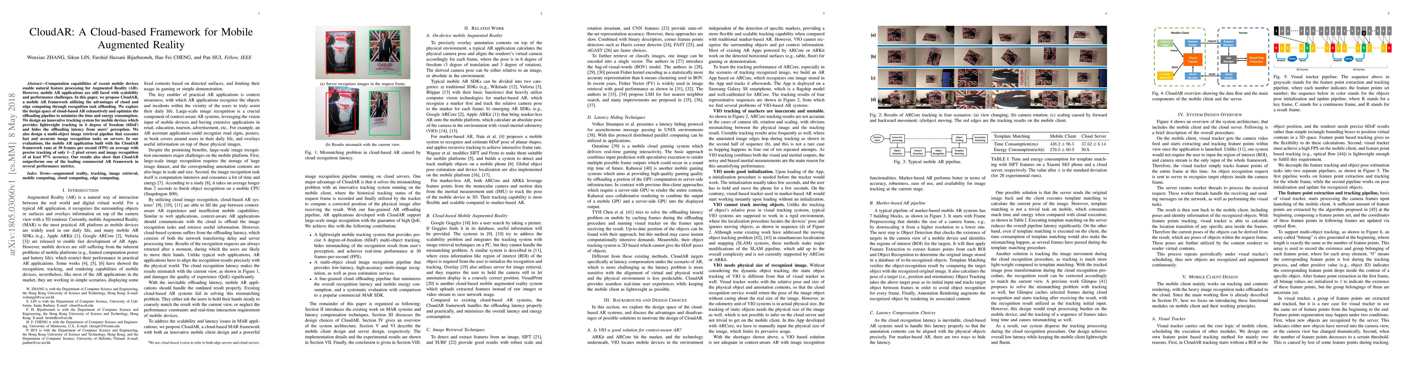 CloudAR is a cloud-based framework that leverages cloud and edge computing to enhance mobile Augmented Reality (AR) by offloading recognition tasks, achieving high performance and low latency. The framework includes an optimized offloading pipeline and a lightweight tracking system, resulting in 30 FPS with minimal tracking errors and high image recognition accuracy.