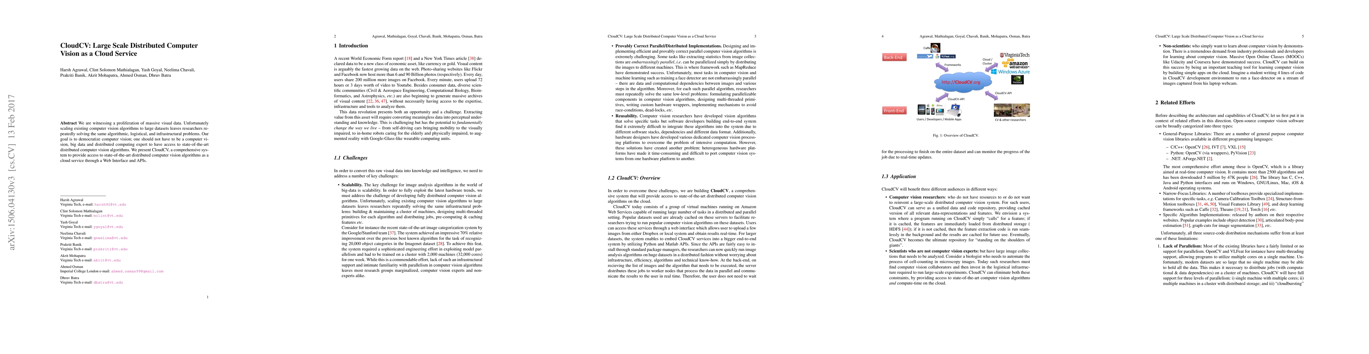 CloudCV offers a cloud-based service for large-scale distributed computer vision, enabling researchers to access advanced algorithms without expertise in big data or distributed computing. It provides state-of-the-art algorithms via a web interface and APIs.
